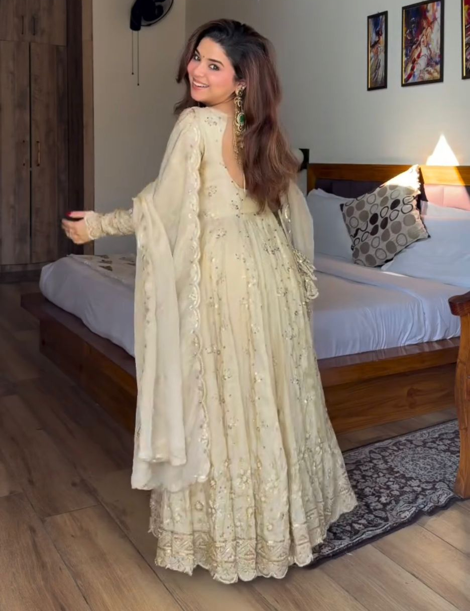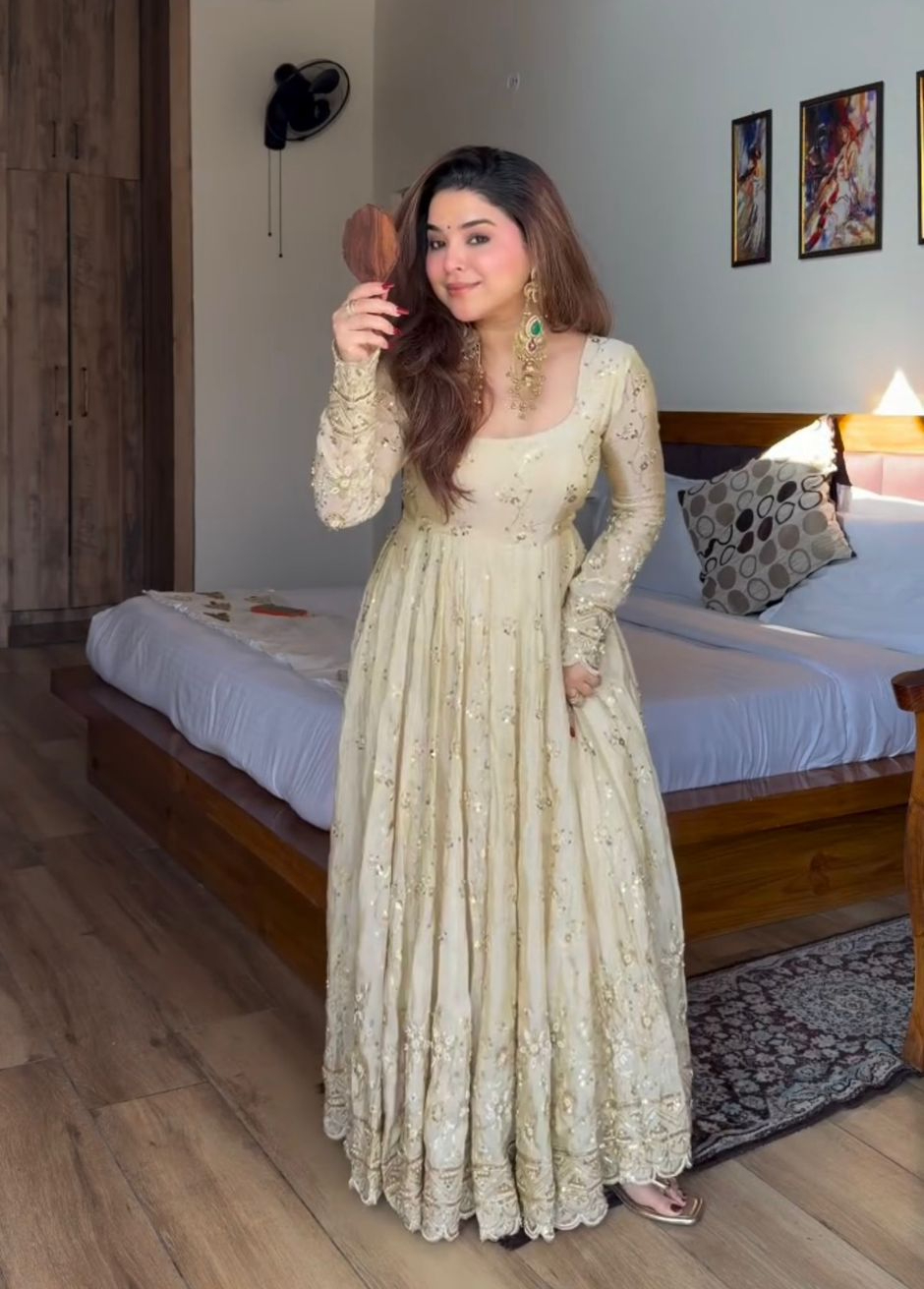 Attractive Cream Chinon Silk Sequence Work Gown