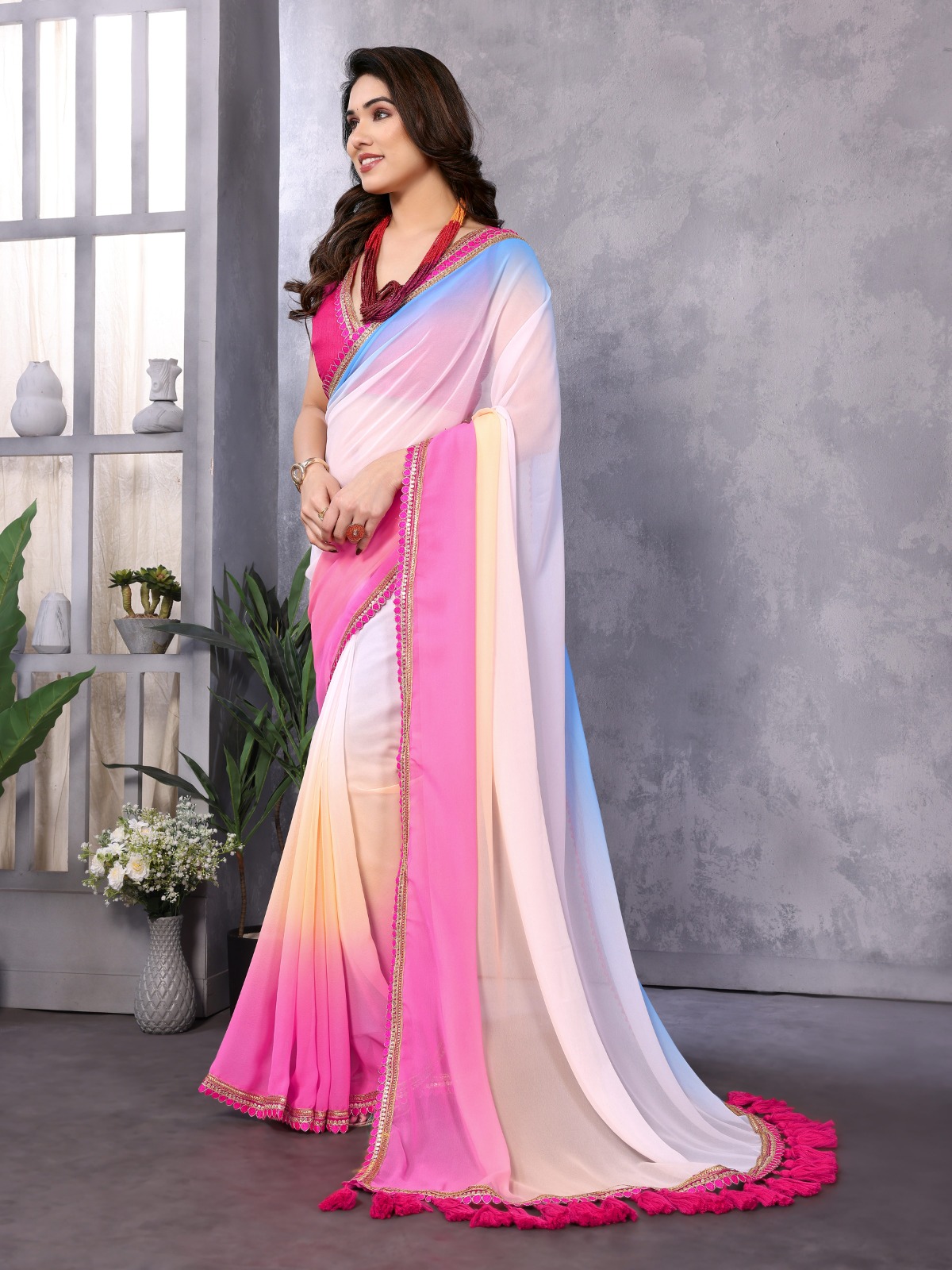 Fabrics | Saree : Faux Peding Georgette Work : Multi Cording Sequence Lace & Big pumpum Lace Blouse : Mono Banglori Work : Multi Cording Sequence Lace & Big pumpum Lace Type : Unstitched |