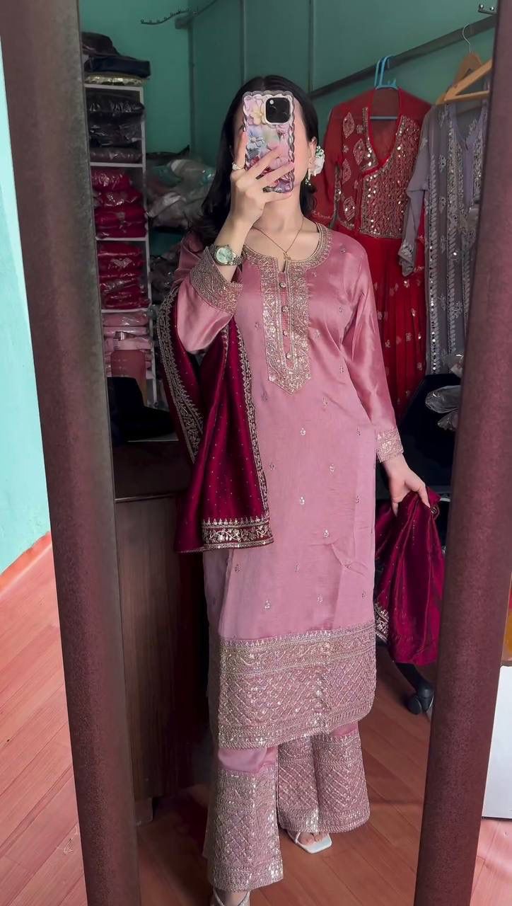 Baby Pink Chinon Lace Embroidery Work Salwar Suit