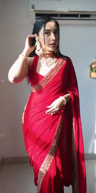 Beautiful Red Color Pure 9000 Velvet With Embroidery Lace Border Saree