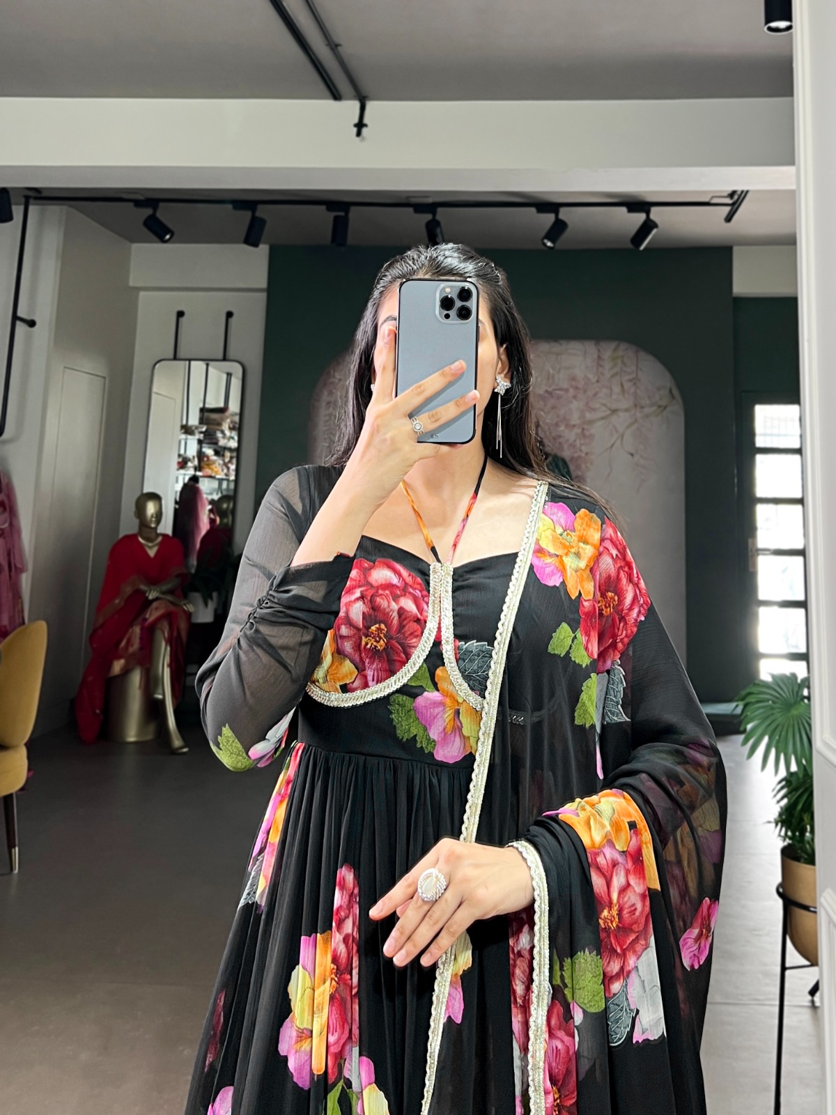 YNF 5103 Black Lace Work Gown in Chiffon. Get it for ₹1899. Wedding, Party, Festive, Events Delivery 4-6 Working Days. Shop now. | Bollywood Gowns, Creative Gowns, Embroidered Gowns, Gowns, Party Wear Gowns
