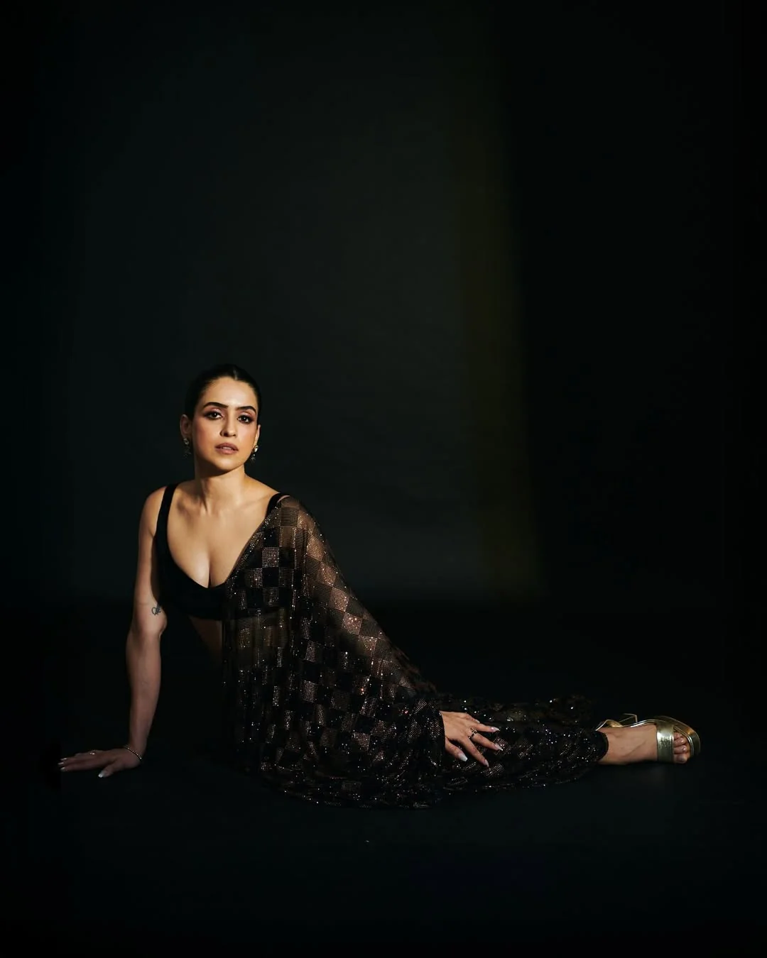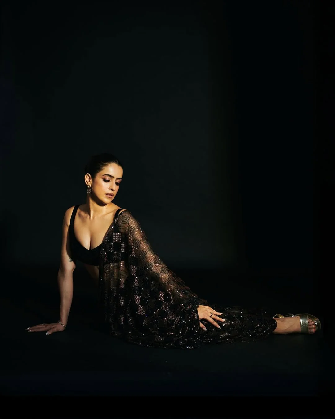 Ruffle style Indian saree ne pura modern twist de diya; elastic waist comfortable, layers bilkul even, perfect for birthday and cocktail shoots.
