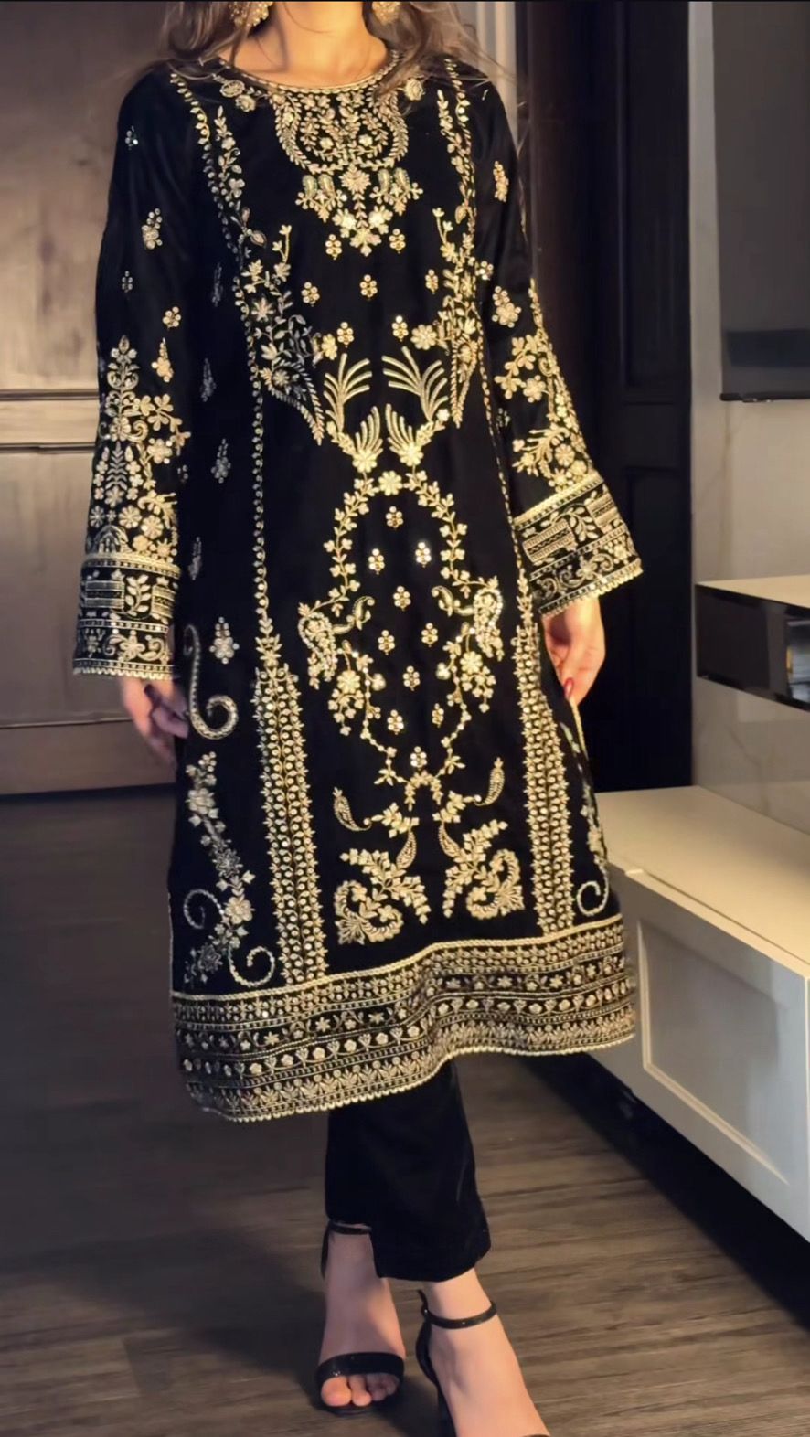 Black Korean Satin Silk Embroidery Work Salwar Suit