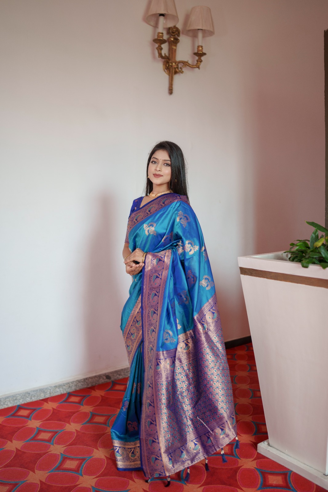 Saree :- Soft Pethani silk Saree with zari weaving design and Meenakari weaving Rich pallu with Meenakari weaving border Tessels attached at Pallu end.