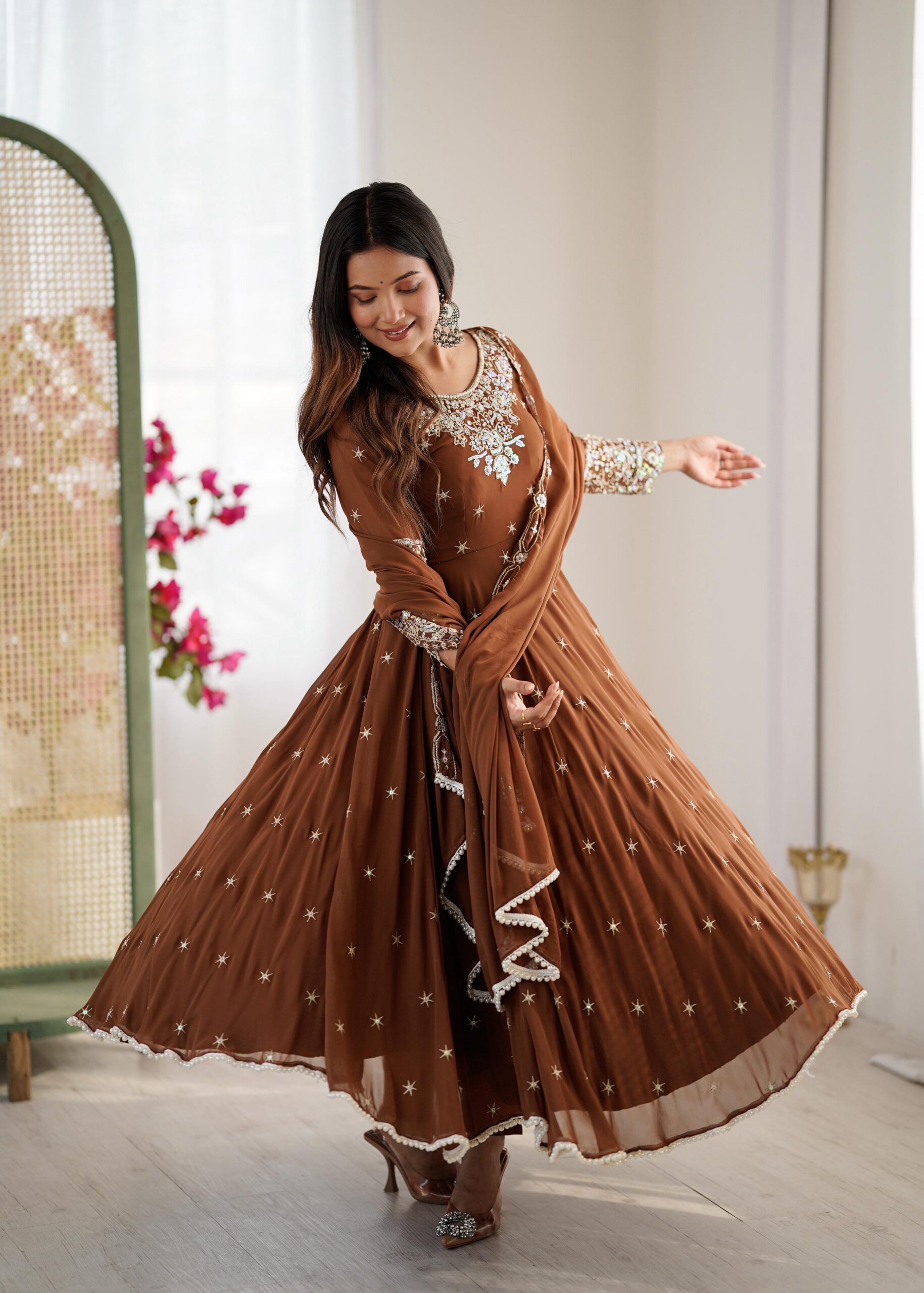 Brown Blooming Faux Embroidery Work Gown