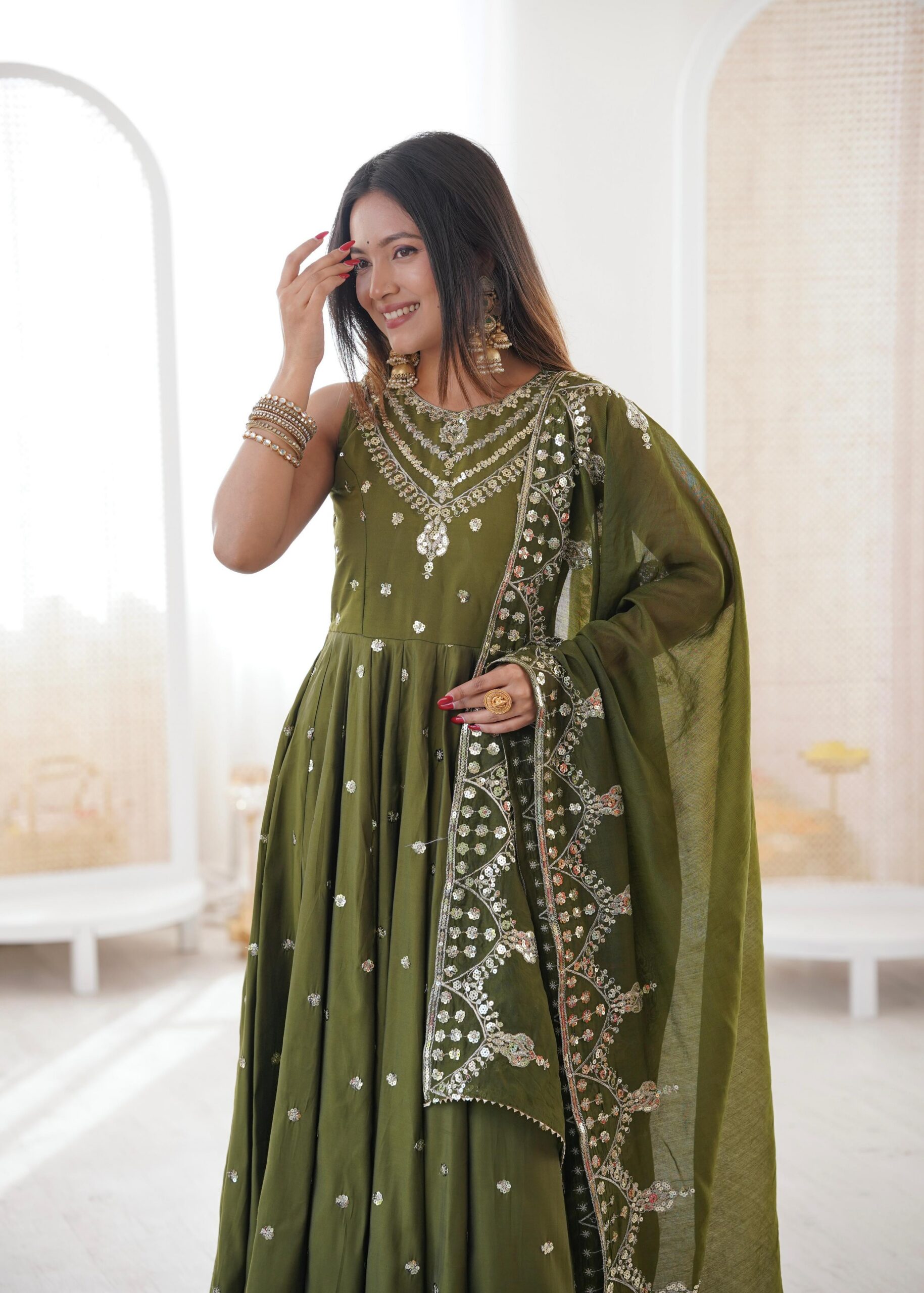 Elegant Mehendi Roman Silk Embroidery Work Gown
