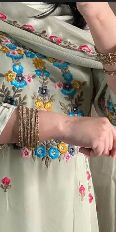 Elegant Pista Chinon Silk Embroidery Work Salwar Suit