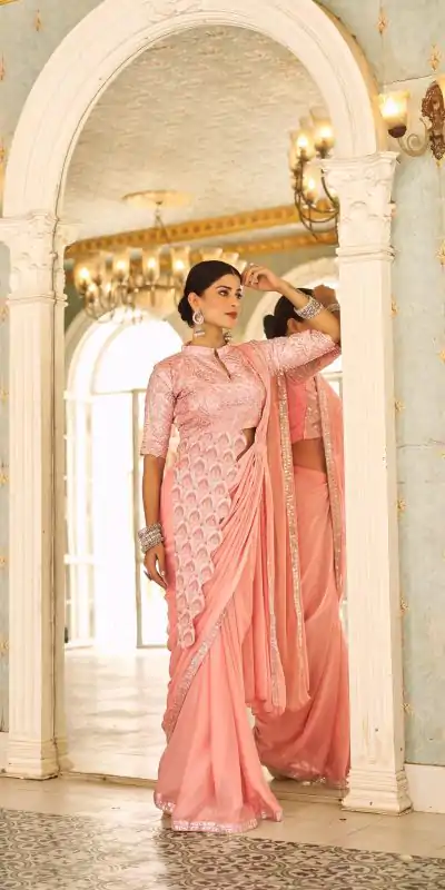 Fabrics | Ready To Wear Saree Saree Fabric :- Chinon Saree Work :- Embroidery Work Lace Border With / Ready To WearBlouse Fabric :- Banglory Work :- Stylist Heavy Embroidery Work/full Stitch Free Size Semi Stitched |