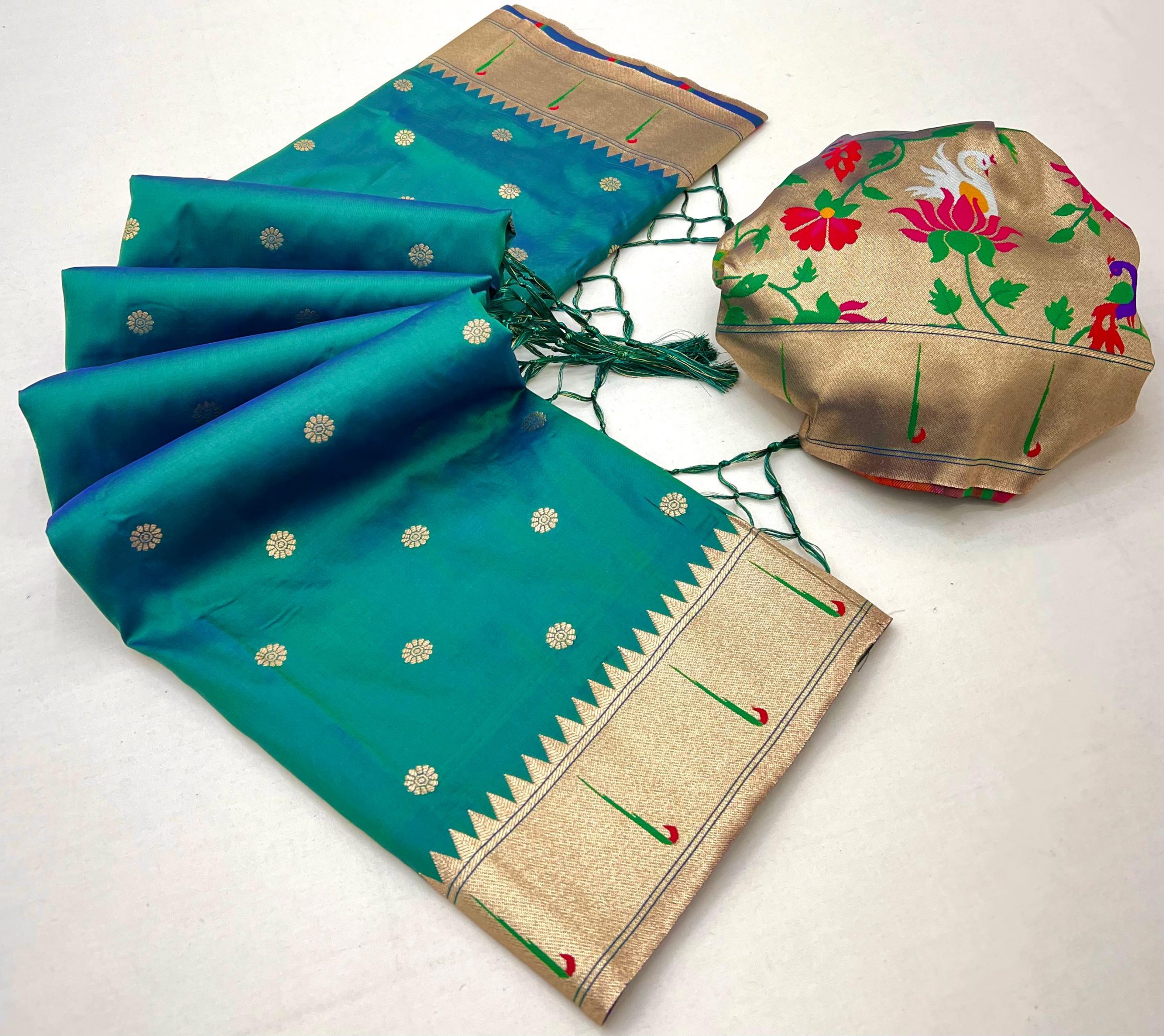 Saree :- A Pethani silk saree are woven using silk yarn and embellished with golden zari & Meenakari threads unique Motifs.