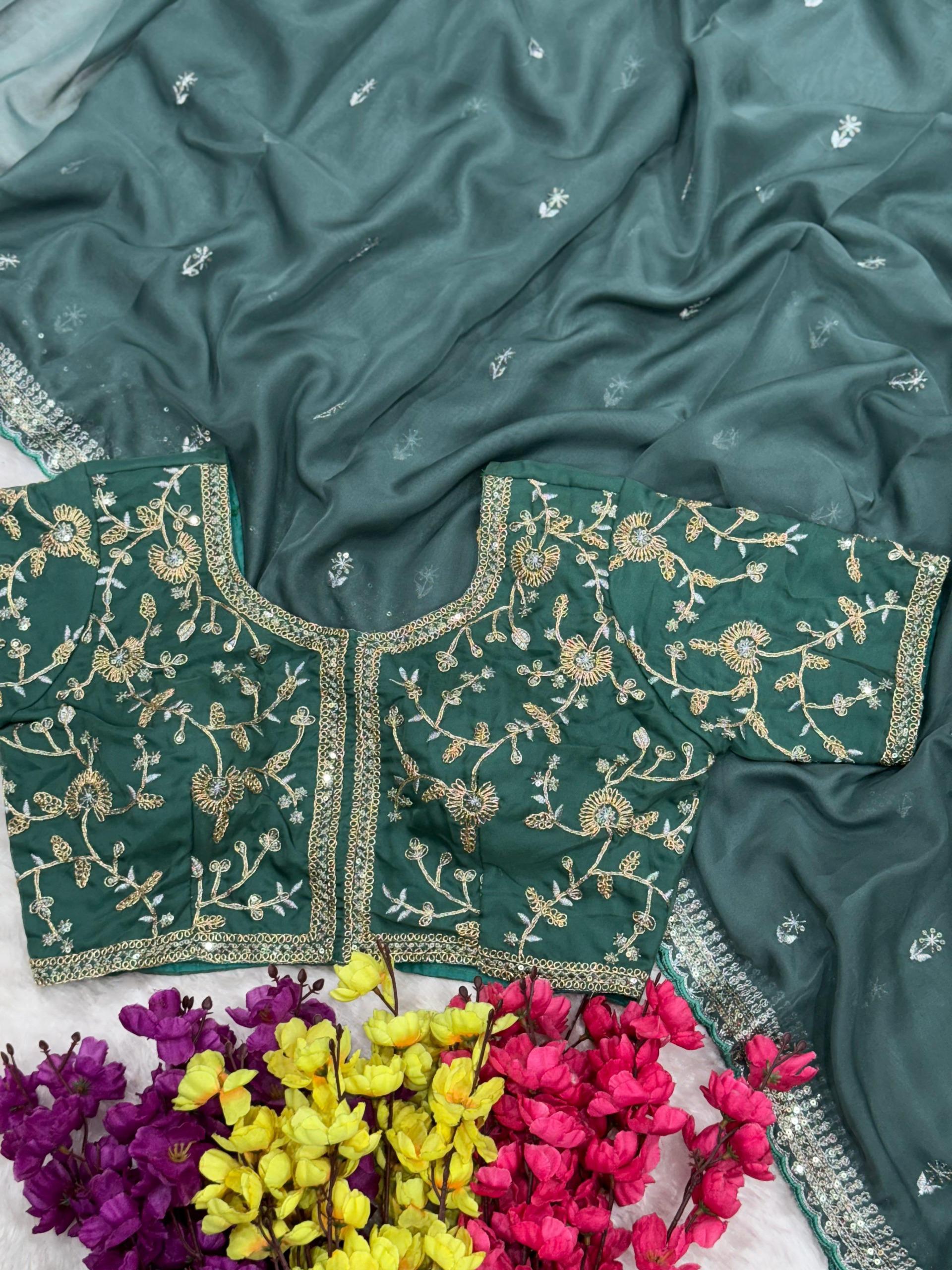 Firozi Soft Organza Zari Embroidery Work Saree