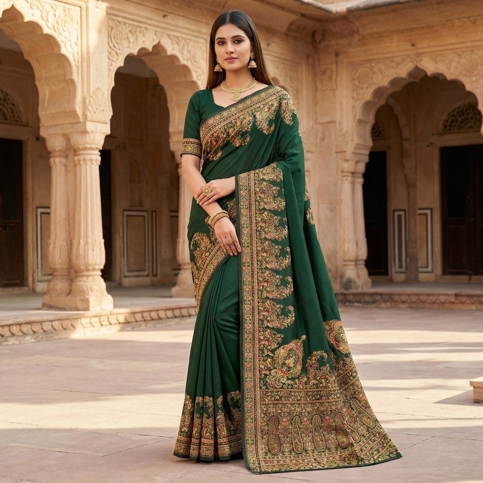 Green Pashmina Silk Lace Work Border Saree