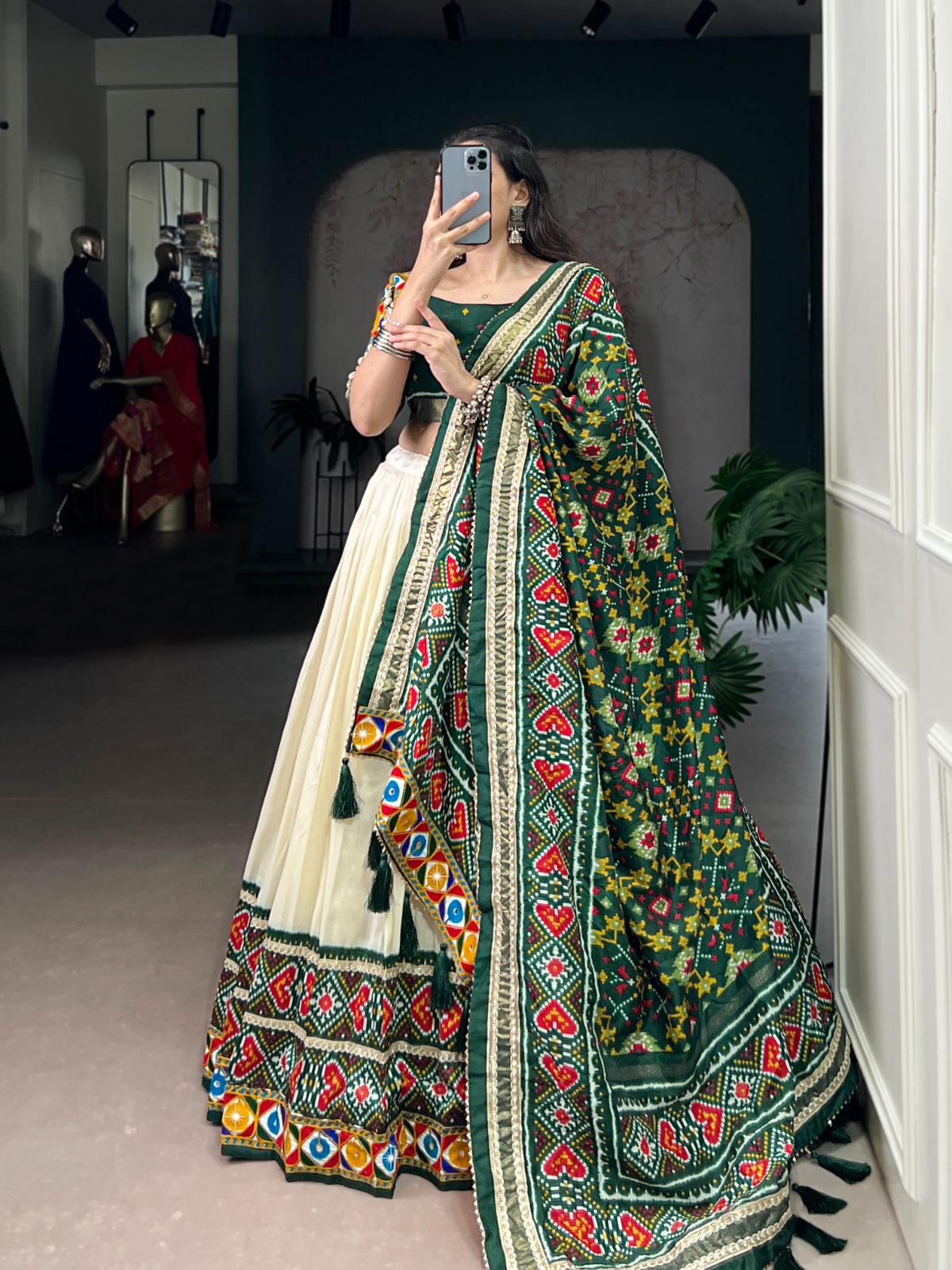 Lehenga Work : Patola Print With Foil Work And Real Mirror Gamthi Work With Lace Touch Up