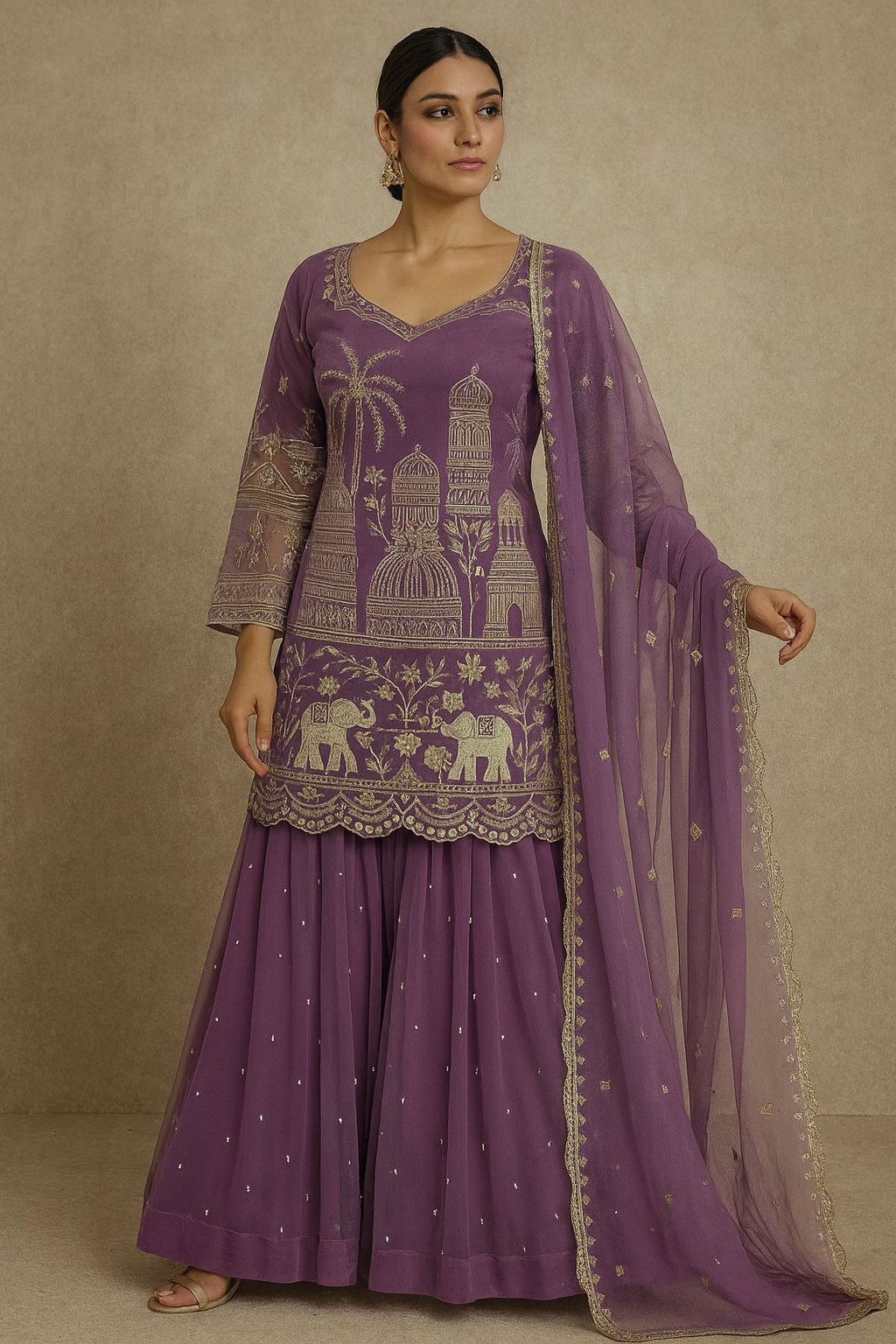 Lavender Twill Net With Embroidery Work Salwar Suit