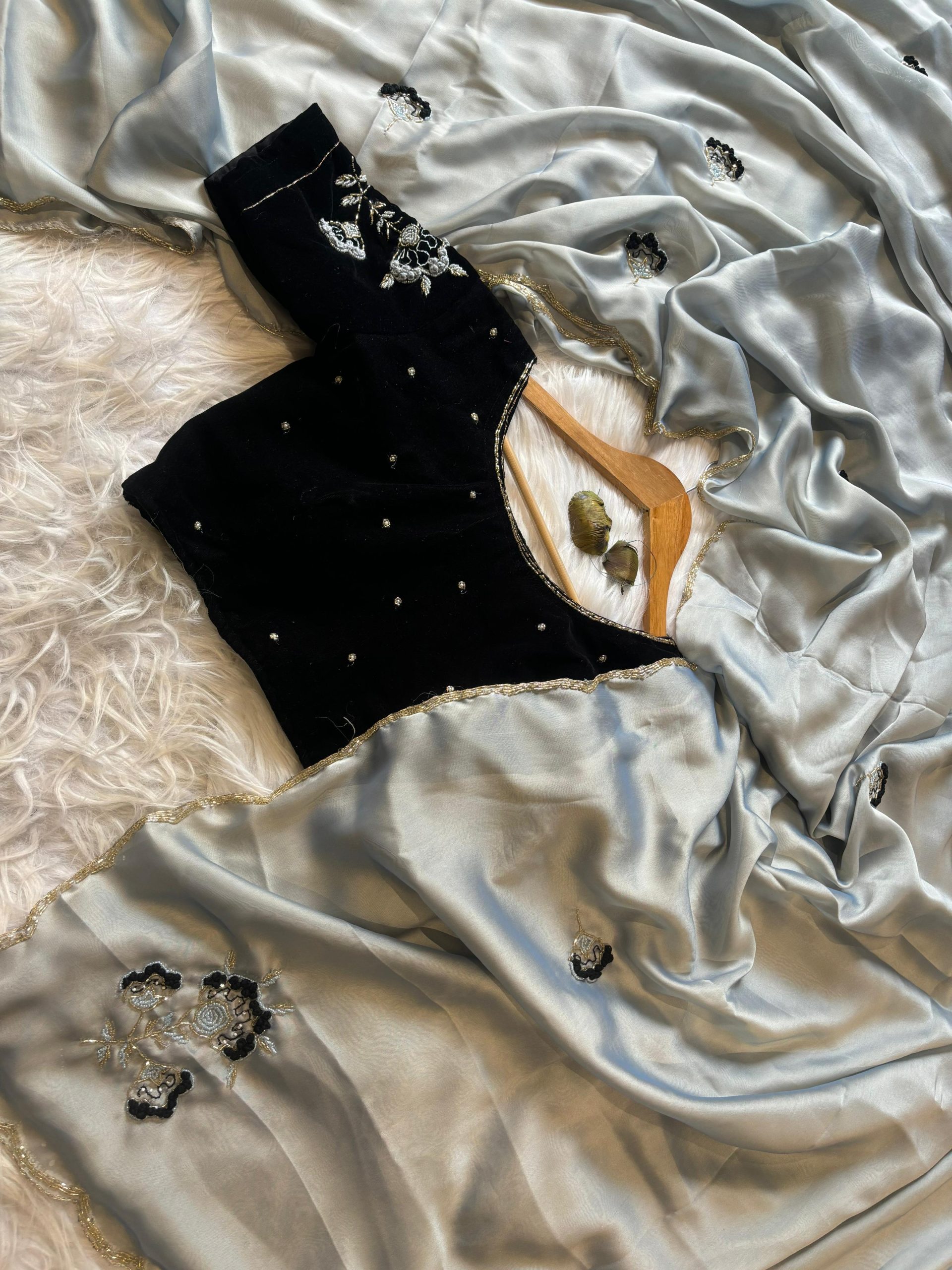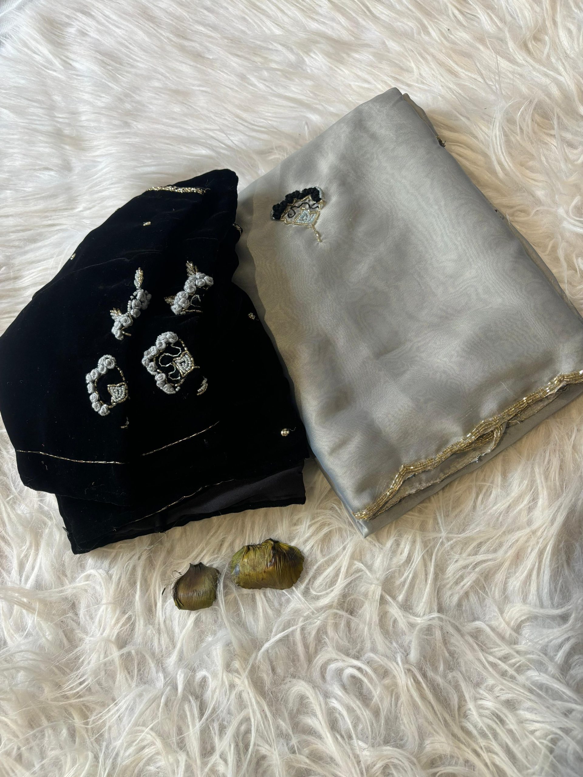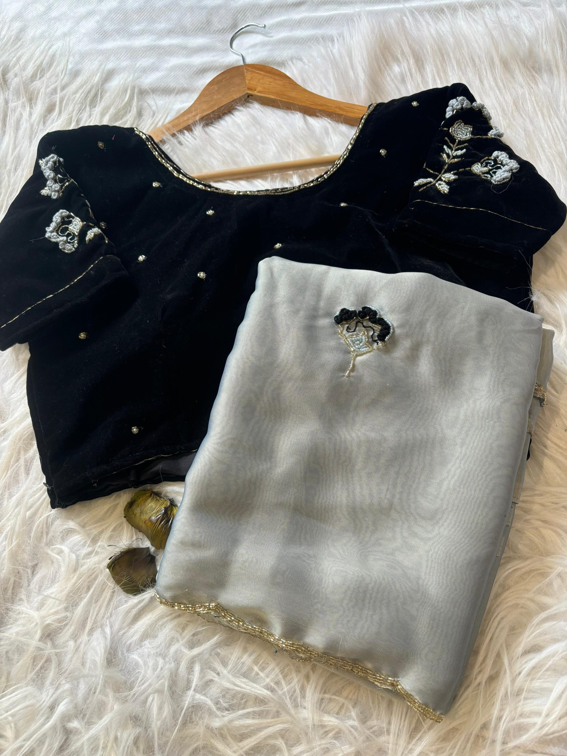 Velvet 9000 Designer Blouse Having 2 Butta Saree Work : Cover With Three Layer Cut Dana Border And Double Layer Arco Border Having Butta All Over Saree Run With Cut Dana, Moti And Resham Thread
