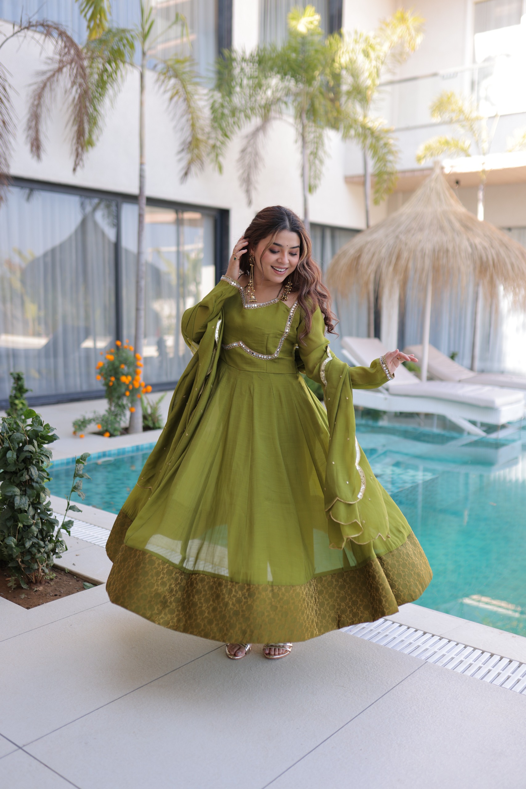 KA 1237 Mehendi Mul Chanderi Anarkali Suit with Embroidery Work & Mirror Work. Grab it for ₹2449. Delivery 4-6 Working Days. Shop now. | Anarkali Suits, Bollywood Anarkali, Creative-Anarkali, Designer Anarkali, Embroidered Anarkali, Party Wear Anarkali