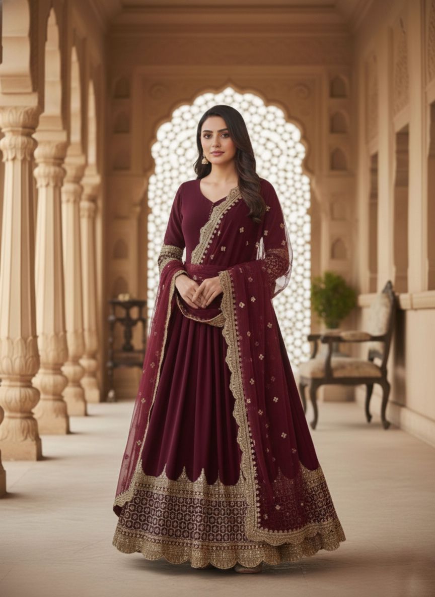 Maroon Faux Georgette With Embroidery Work Gown