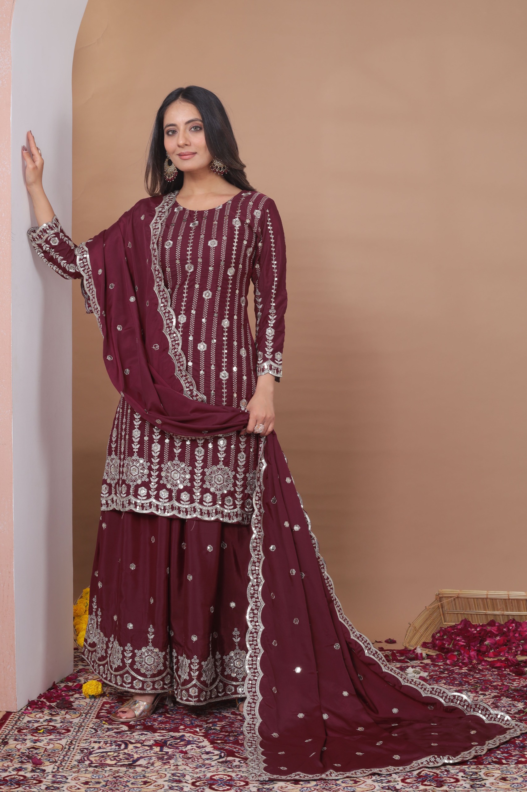 Maroon Natural Crap Embroidery Work Salwar Suit