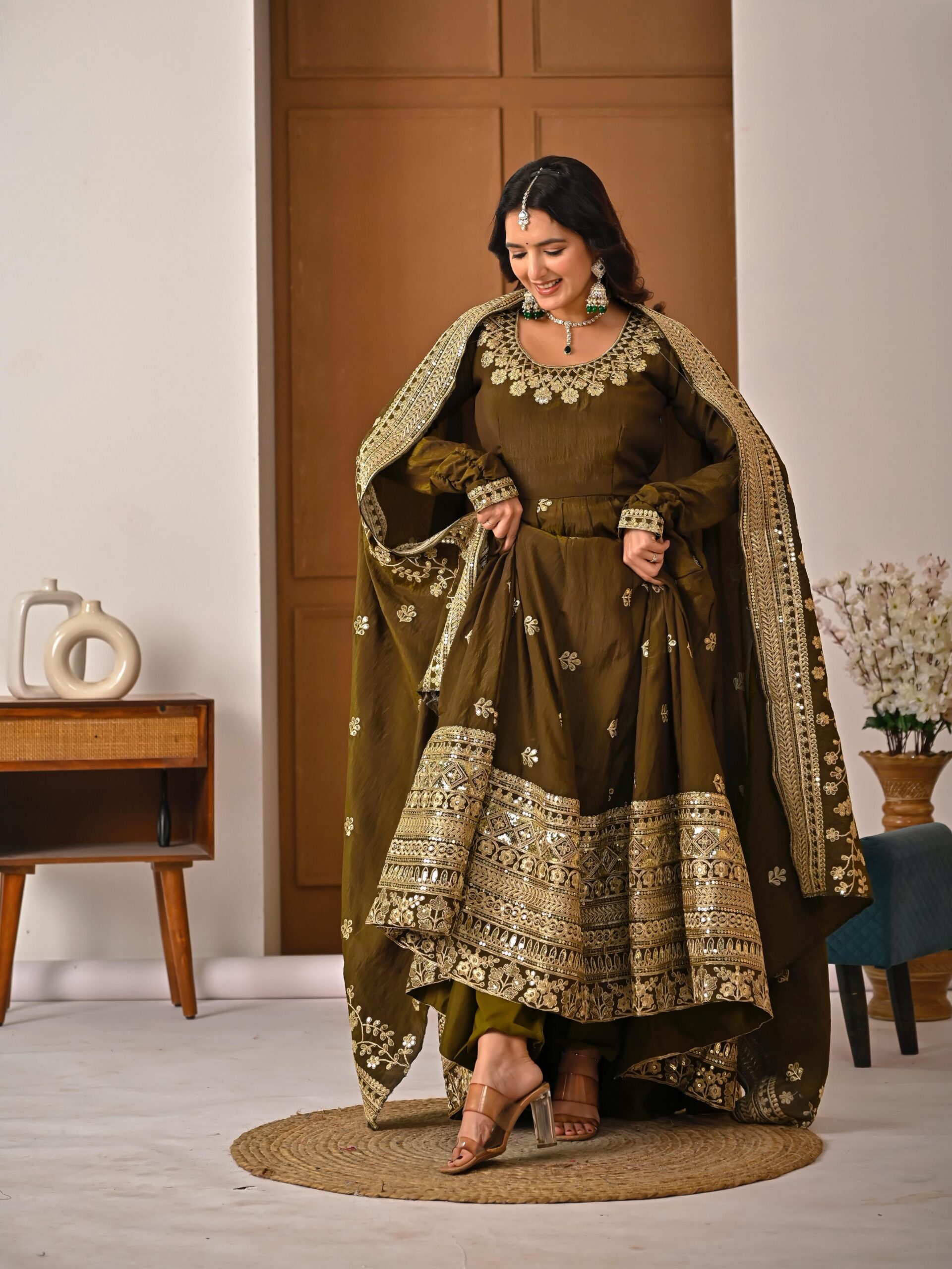 Anarkali Fabric : Heavy NC Vichitra Silk With 5 mm Sequence And Embroidery Work ( Fully Sleeves )Anarkali Flair: 4 mtr (With Cancan Patta)