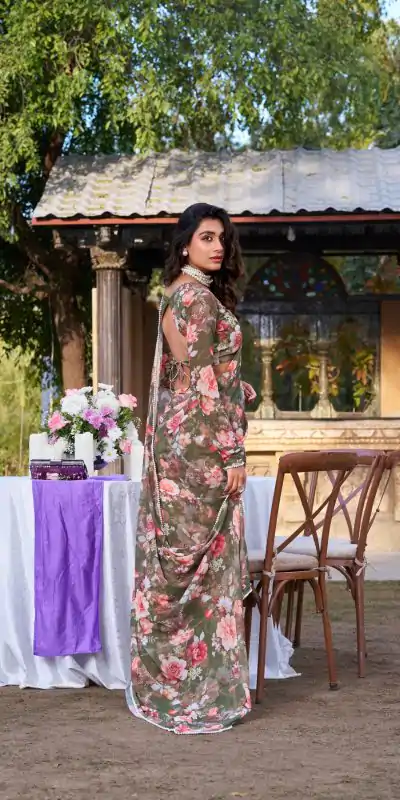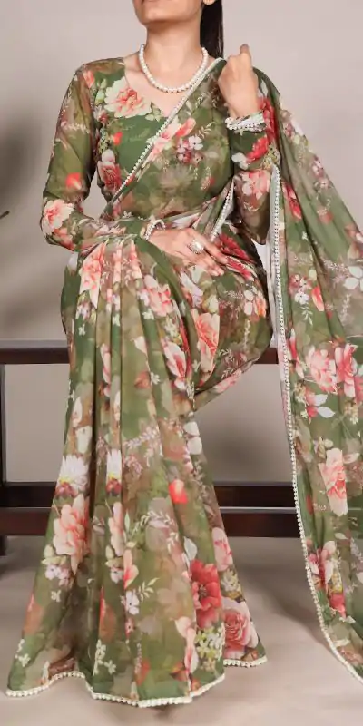 Mehandi Weightless Printed Pearl Saree