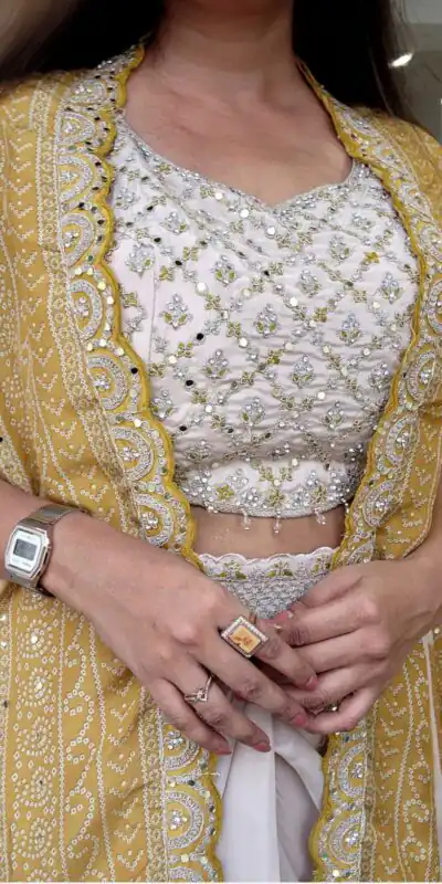 Work: -; Bandhani Print With Real Mirror & Embroidery Lace Work |
