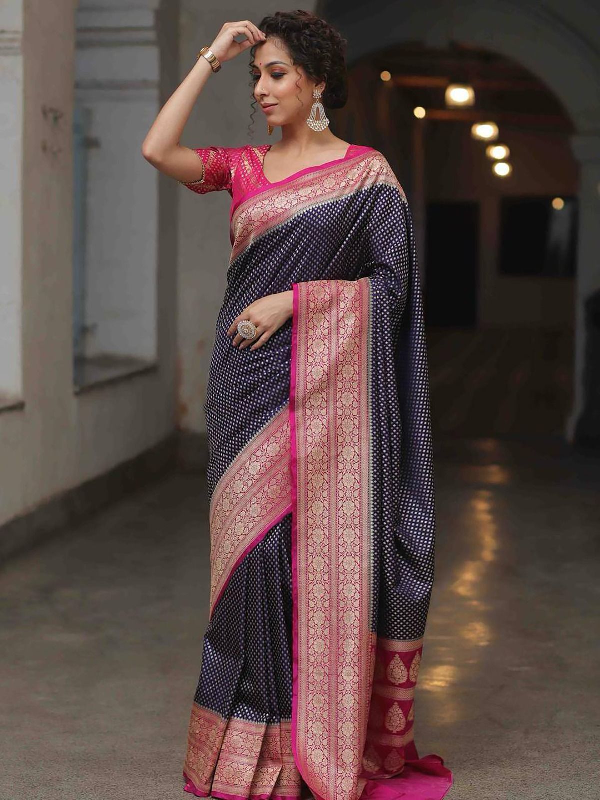The texture is smooth but the saree feels heavy and rich. Normal wash makes it a practical choice.