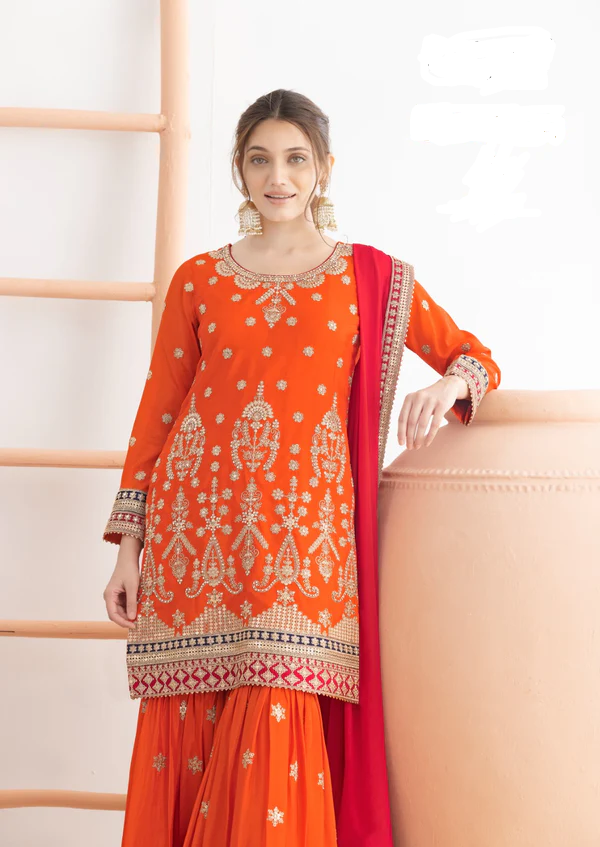 Orange Chinon Embroidery Mirror Work Salwar Suit