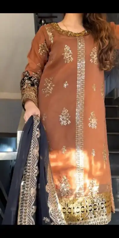 Orange Nylon Twil Net Embroidery Work Salwar Suit