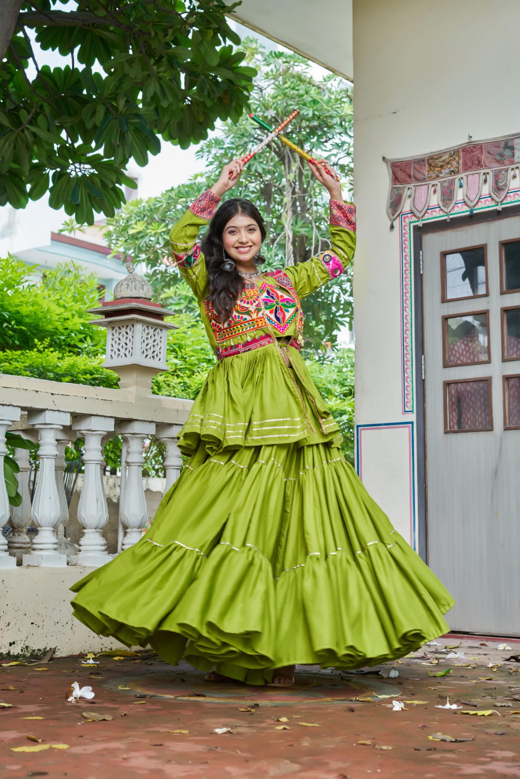Ram 120 Parrot Green in Pure Cotton Mirror Work & Gamthi Work Lehenga Choli . Exclusive Offer ₹3049. Delivery 4-6 Working Days. Shop now. | Bollywood Lehenga, Creative Lehenga, Designer Lehenga, Embroidered Lehenga, Lehenga, Party Wear Lehenga
