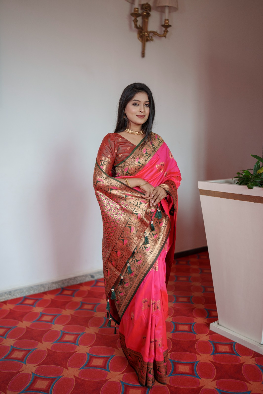 Saree :- Soft Pethani silk Saree with zari weaving design and Meenakari weaving Rich pallu with Meenakari weaving border Tessels attached at Pallu end.