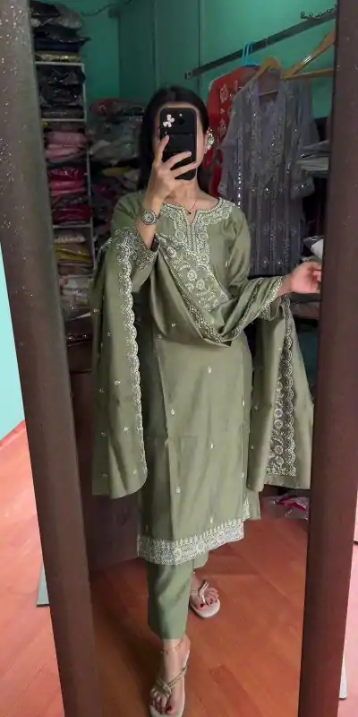 Pretty Mehndi Chinnon Silk Embroidery Sequence Salwar Suit