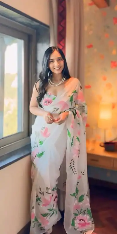 Fabrics | Fabric : pure soft Georgette silk Work : beautiful flowers design All over Blouse :Beautiful same Blouse piece |