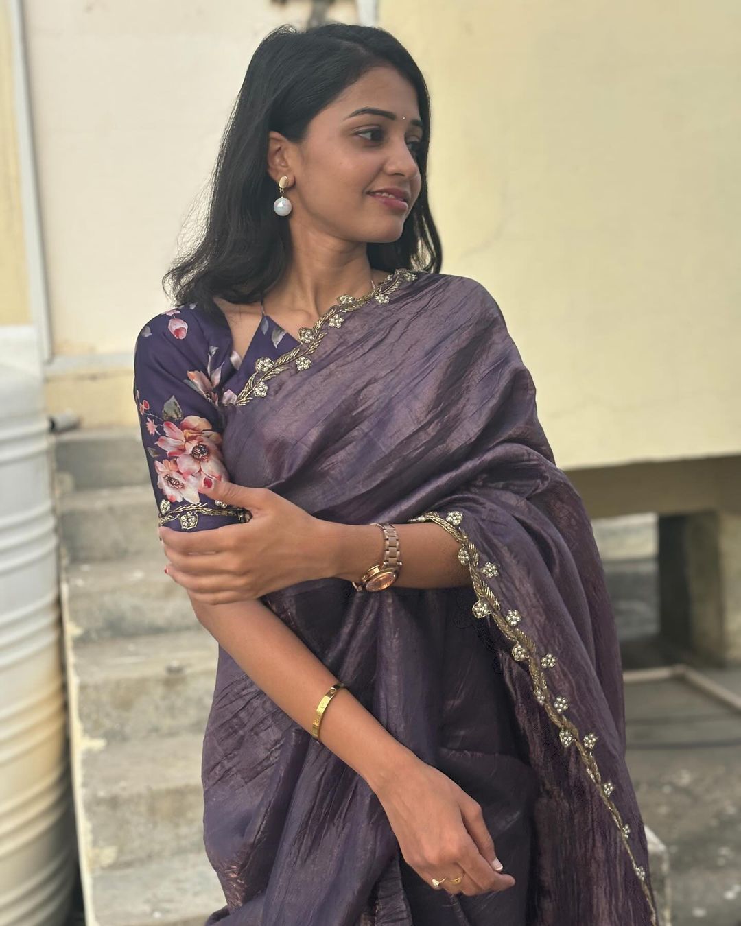 Blouse work : Digital Flower Print Have Front And Sleeves Handwork.