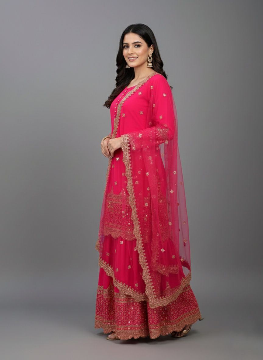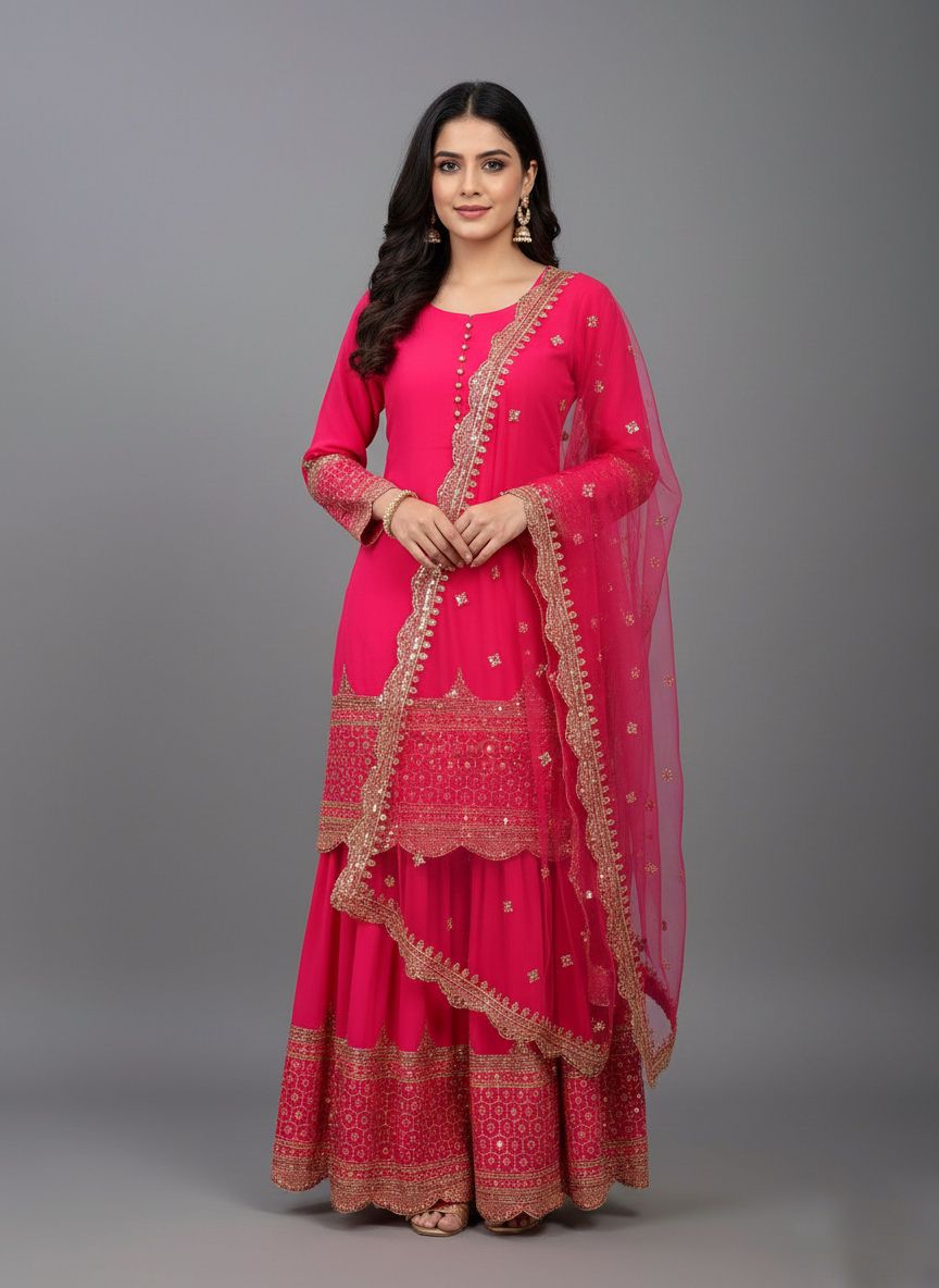 Top : Heavy Faux Georgette With Heavy 5mm Embroidery Sequence Work With Full Sleeve and Potli Button Inner : Heavy Micro cotton Length : 37-38 Inch Size :  Free Size Work :Embroidery Sequence Work Type : Semi Stitched                                                                                                                                                                                                            Palazzo  :Heavy Faux Georgette With 5mm Embroidery Sequence Work With Fully Flair Palazzo inner :Heavy Micro Cotton Palazzo Length:40-41 Inch