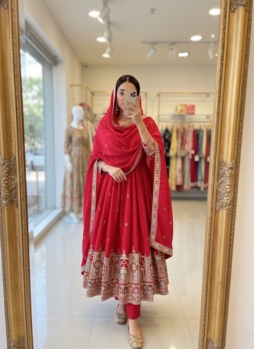 Red Chinon Silk Coding Dori Sequence Work Gown