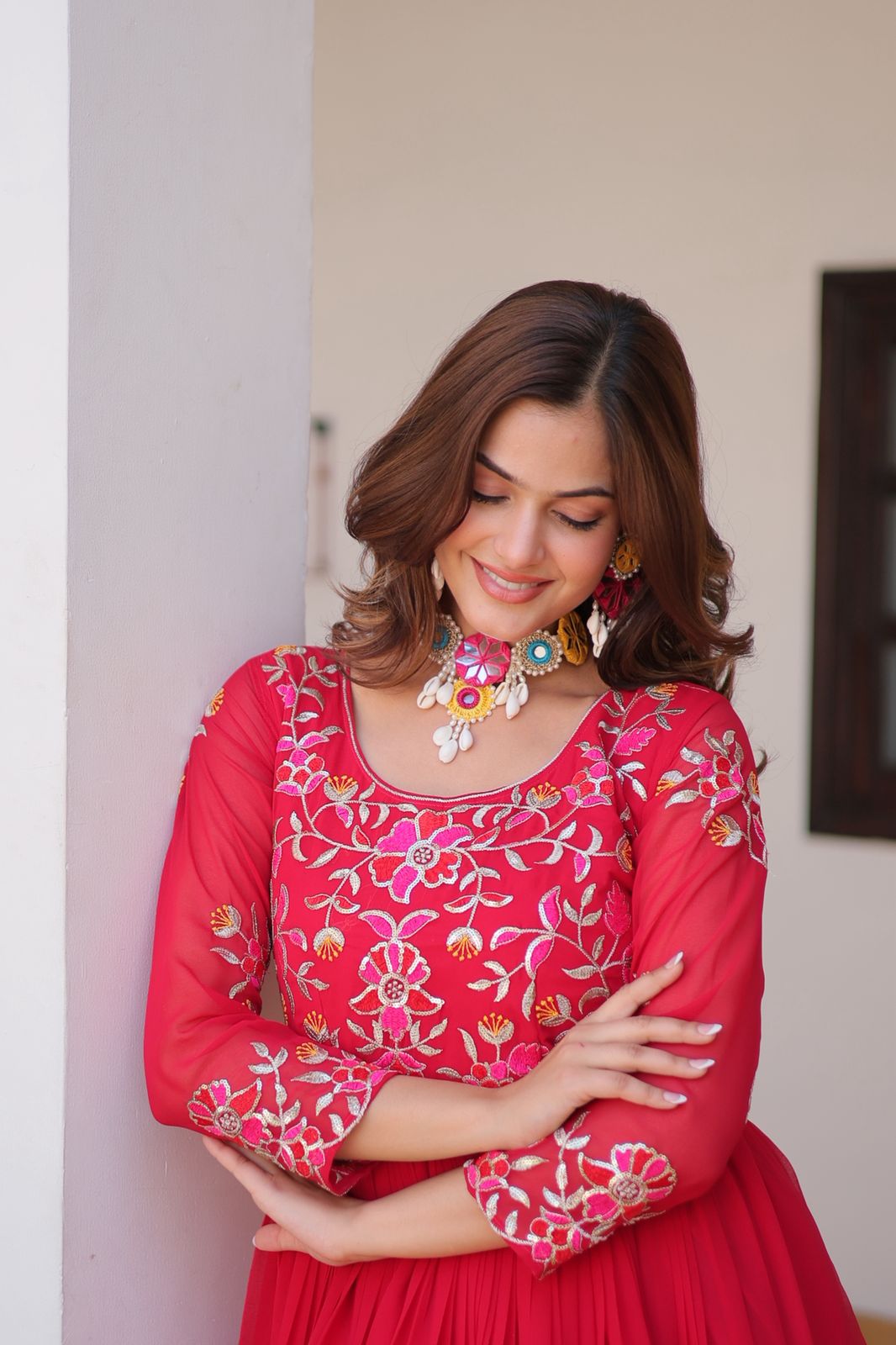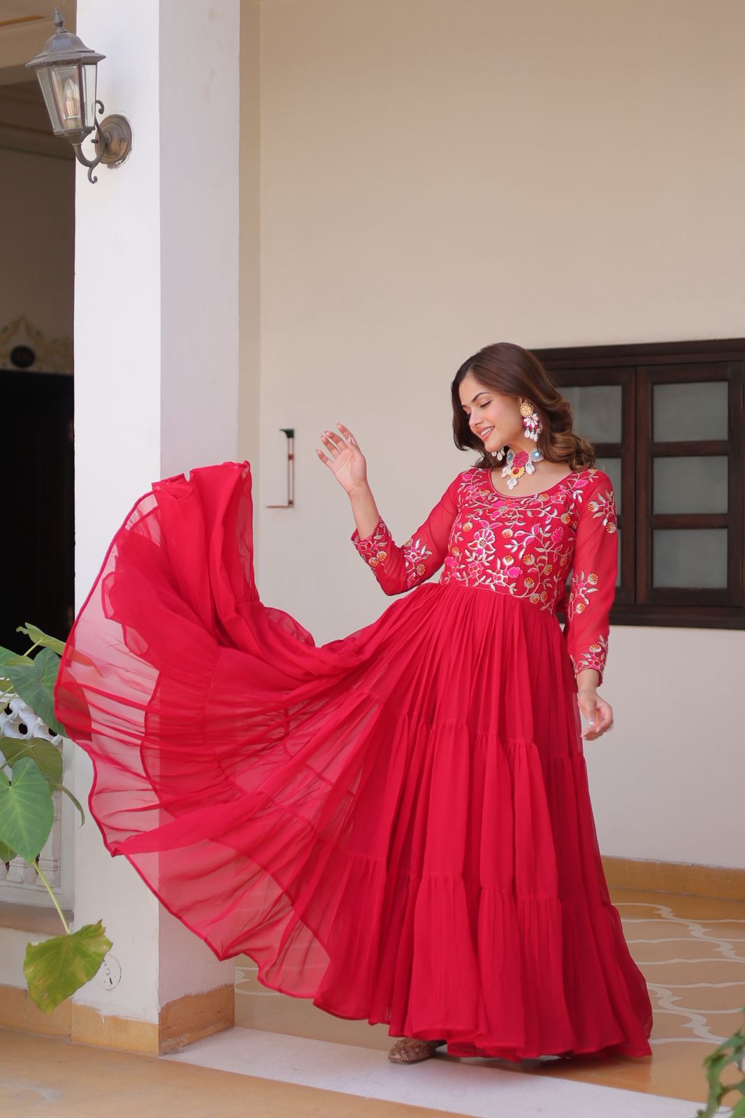 Gown Fabric:- Fox Georgette Work:- Heavy 3mm sequence Thread Work Inner:- Micro Cotton Flair:-7.50 mtr Size:- free Size Semi Stitched (Fully Stitched) |