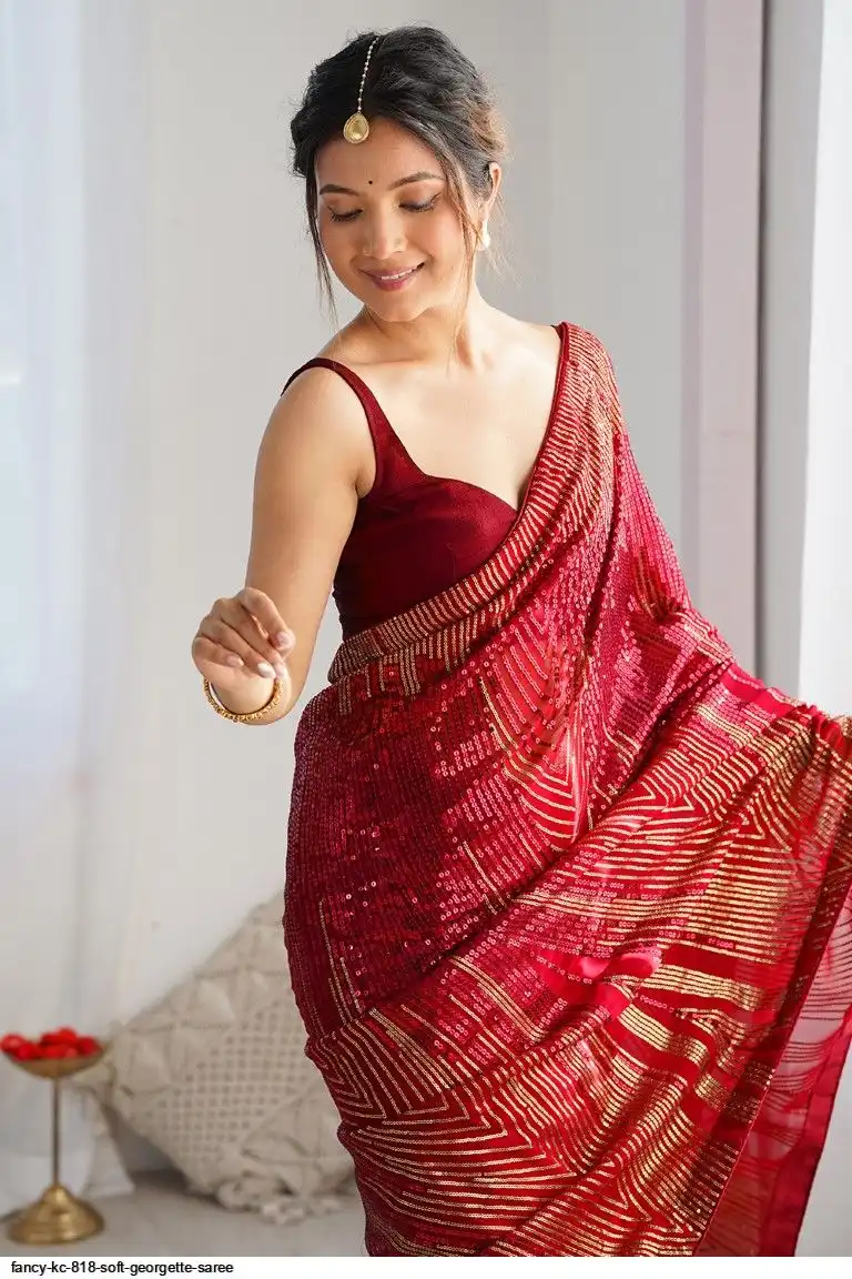 Organza Indian saree ki border patli hai, spotlight events ke liye enough impactful nahi; intimate gatherings ke liye chal jati.