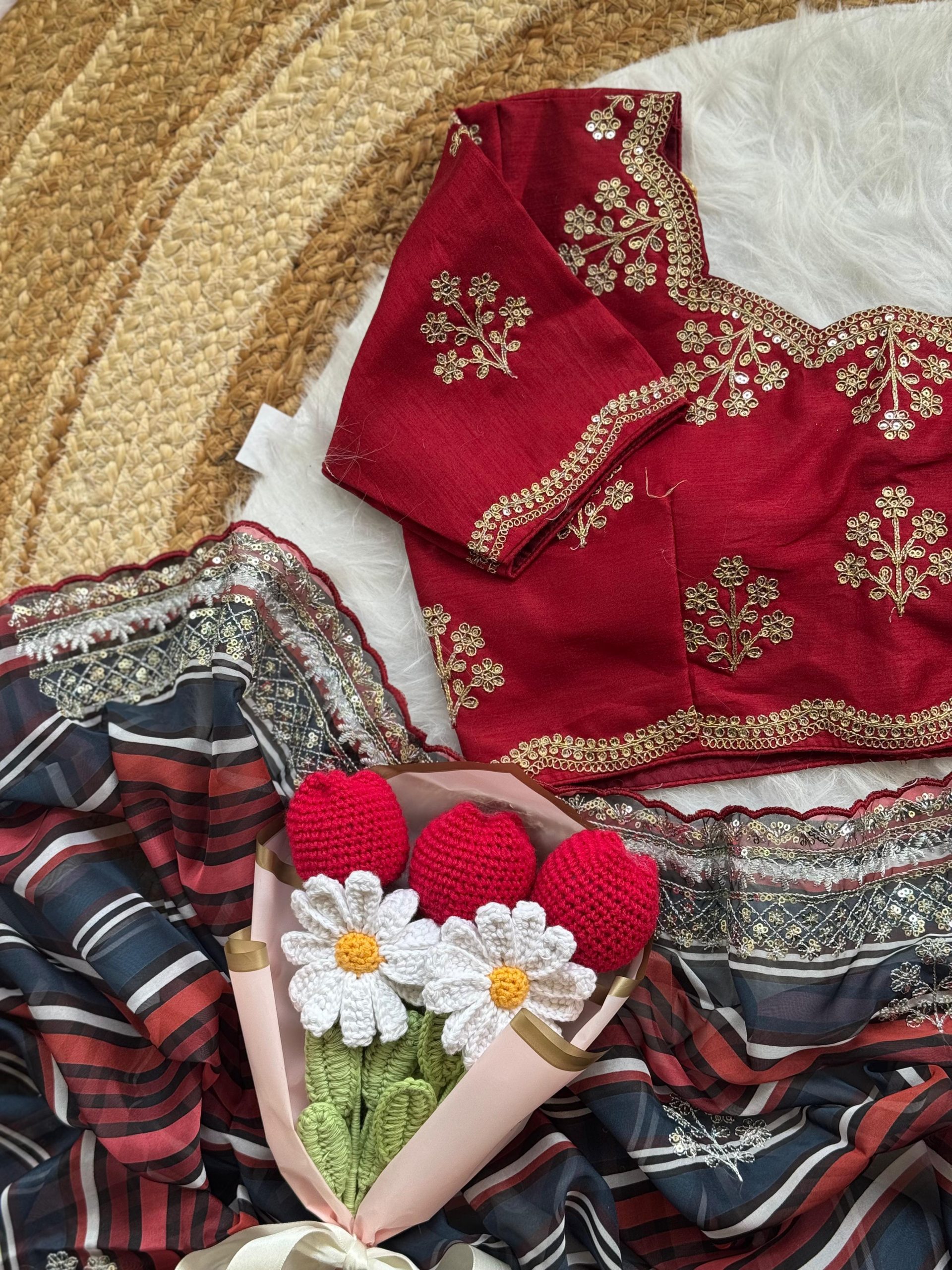 “I appreciate the transparent sizing information provided. The blouse and petticoat fit perfectly with the saree.”