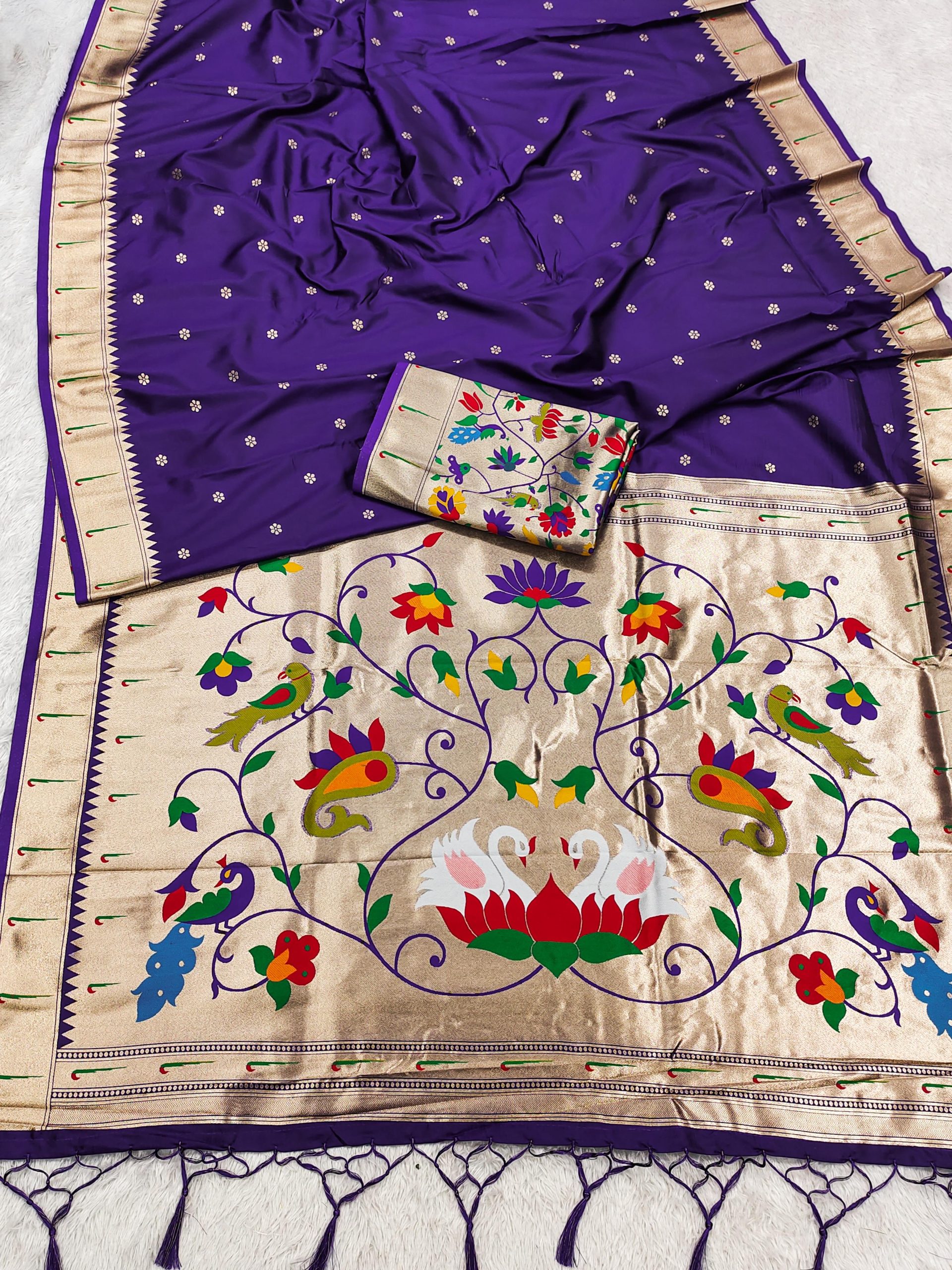 Saree :- A Pethani silk saree are woven using silk yarn and embellished with golden zari & Meenakari threads unique Motifs.Rich Tassels attached Munia Border