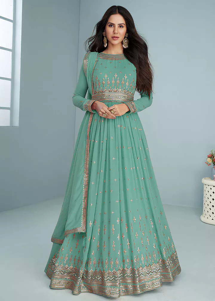 Top :- Georgette with Embroidery Work Sleeves :- Georgette With Embroidery Work Inner :- Santoon Length :- Max up to 56 Size :-. Free Size Semi Stitched Lengthen 44 Bottom:- Santoon Dupatta :- Georgette With Embroidery Work |