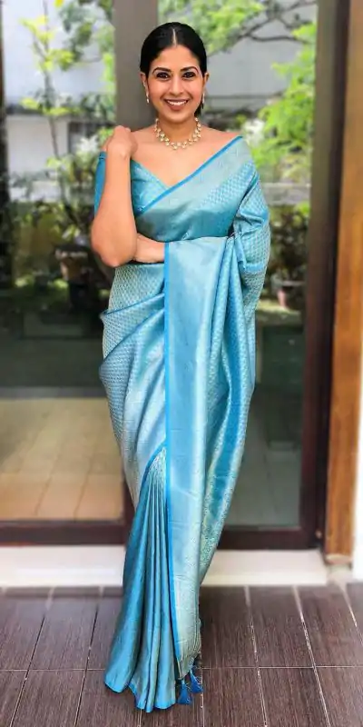Sky Blue Soft Lichi Silk Lace Work Saree