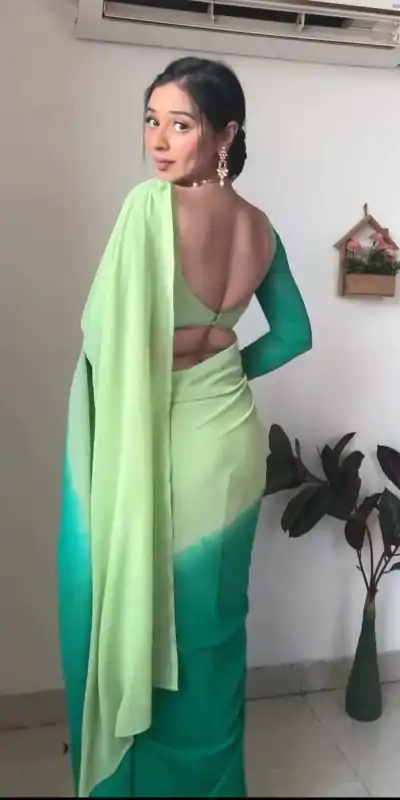 | Fabrics | Saree Fabric :pure soft Georgette silk Saree Work : All over the body Ready To Wear saree pista and green color combination Saree : 5.5 Mtr Blouse Fabric : multicolor Blouse piece Blouse: 0.80 CMtr Ready To Wear saree |