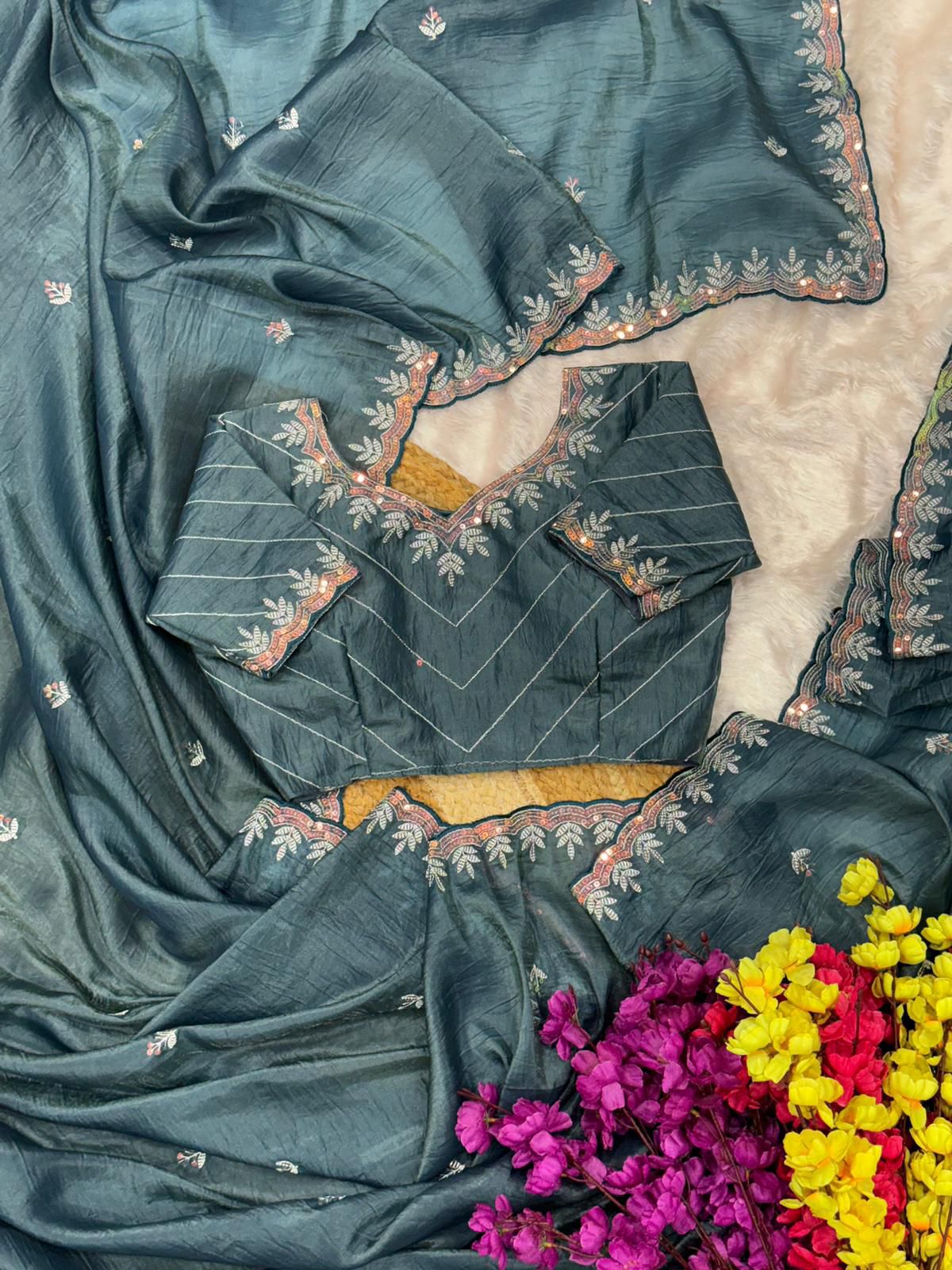 Saree : Gold Crush Jericho Saree Fabric With Heavy Embroidery On Saree With Jari And Sequence Work.