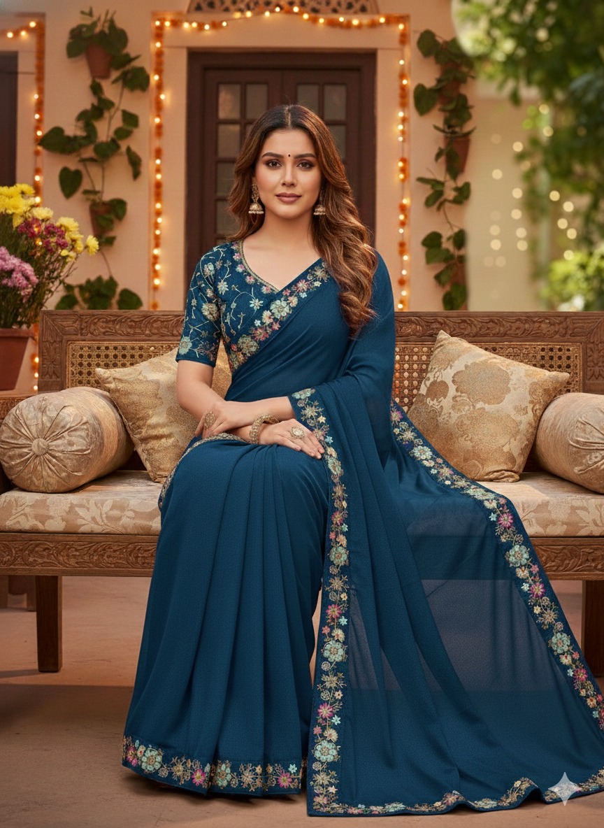 JR 658 Teal in Color Star Georgette ace Work & Embroidery Work Saree . Now at just ₹1699. Delivery 4-6 Working Days. Shop now. | Bollywood Sarees, Creative Sarees, Designer Sarees, Embroidered Sarees, Ethnic Saree, Modern Digital sarees, Party Wear Sarees, Sarees