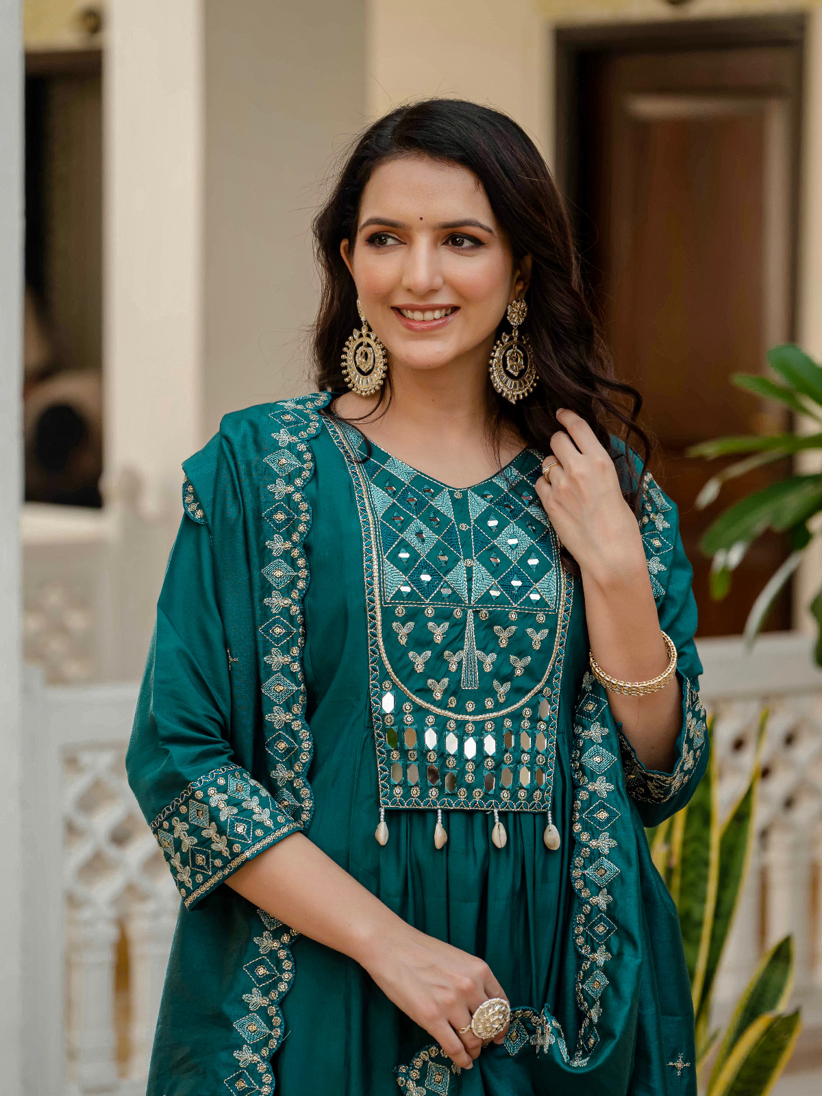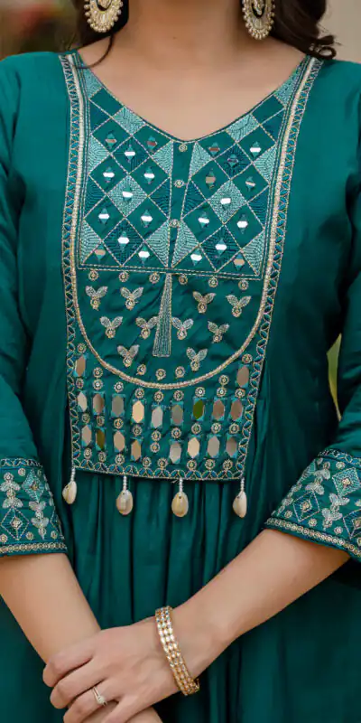 Teal Viscose Roman Silk Mirror Work Anarkali Suit
