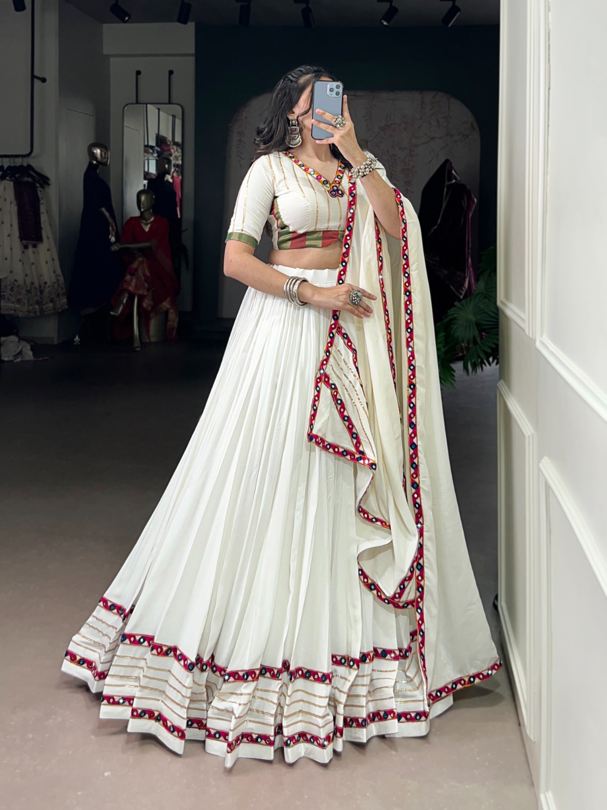 White Rayon Mirror Gamthi Work Lehenga Choli
