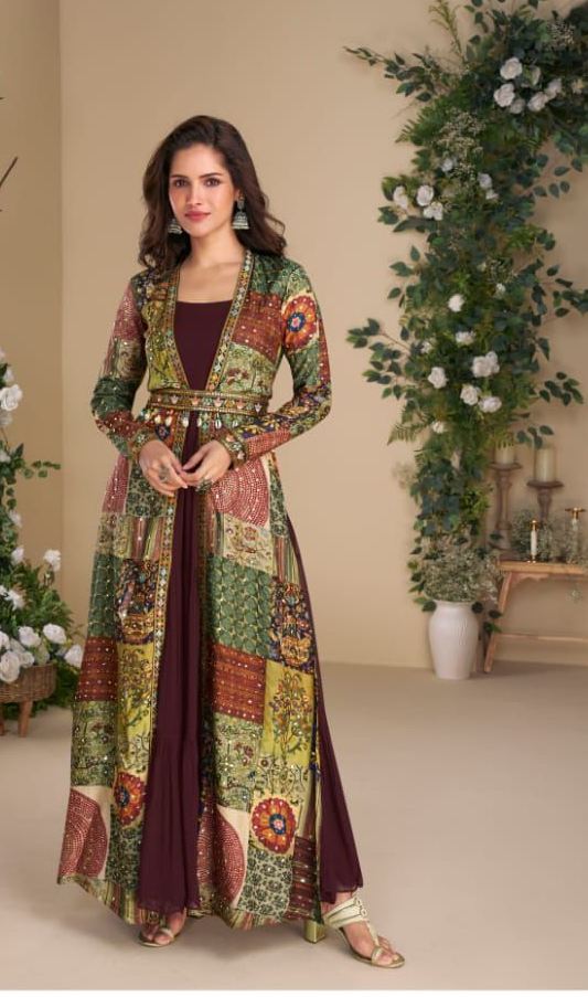 Wine Blooming Georgette Mirror Work Embroider Kurti