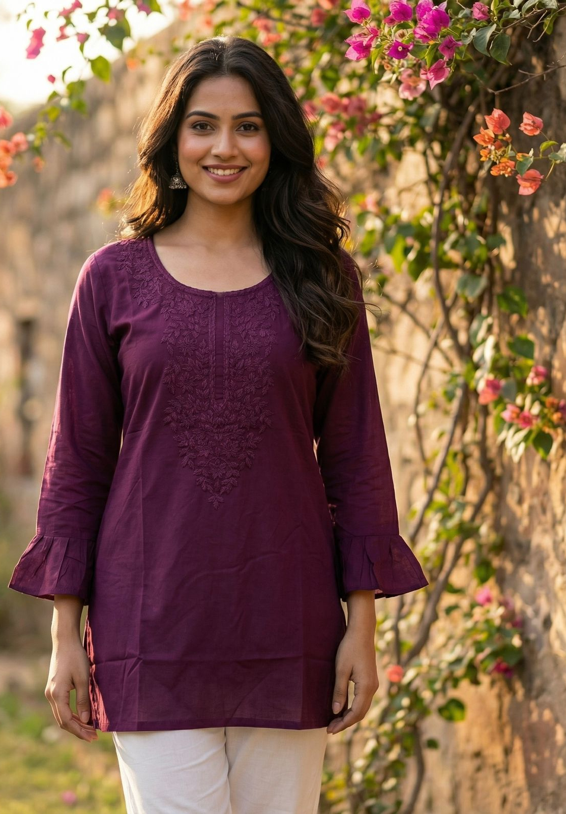 Kurti Work : Chikan Work with Fancy sleeves pattern Size: Free Size Semi Stitched