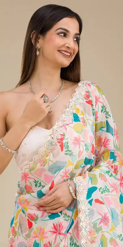 Wonderful Cream Color Georgette Digital Prints & Embroidery Codding Sequins Work Saree